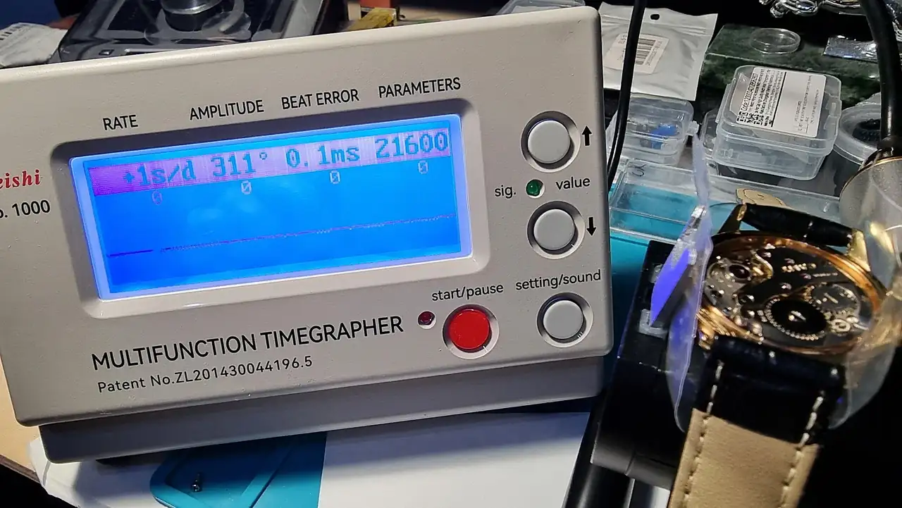Ya solamente quedaba ensamblarlo todo y comprobar el estado de marcha del pequeño movimiento. Realmente es un movimiento que tras el servicio y un ajuste básico marcha muy bien: el volante cuenta con una gran amplitud, el “beat error” es mínimo y goza de una precisión realmente buena. Lo siento porque la pantalla del cronocomparador ha salido con los colores un poco raros, no es que esté estropeada sino que supongo que ha salido así por cuestiones de la luz al hacer la foto: