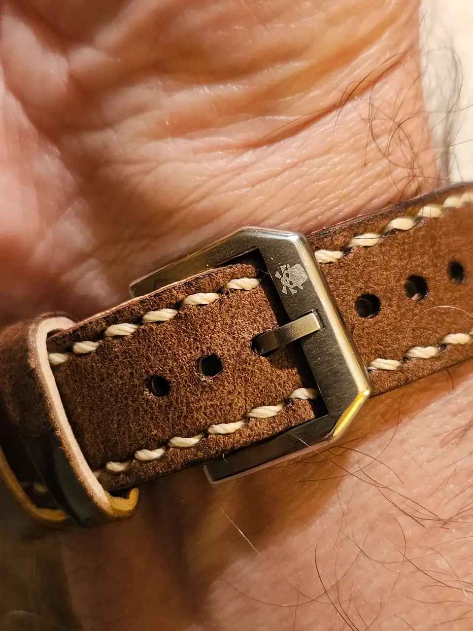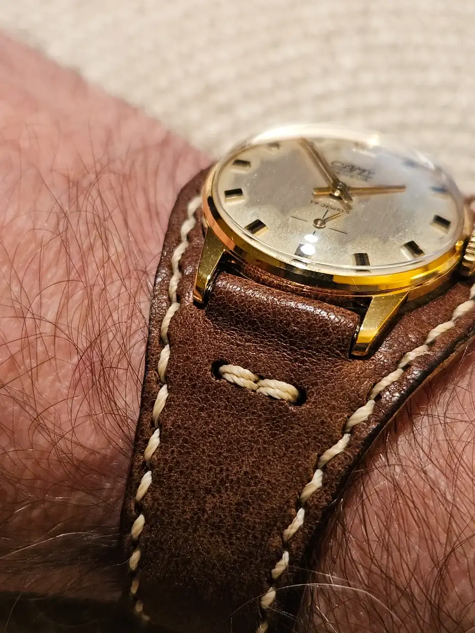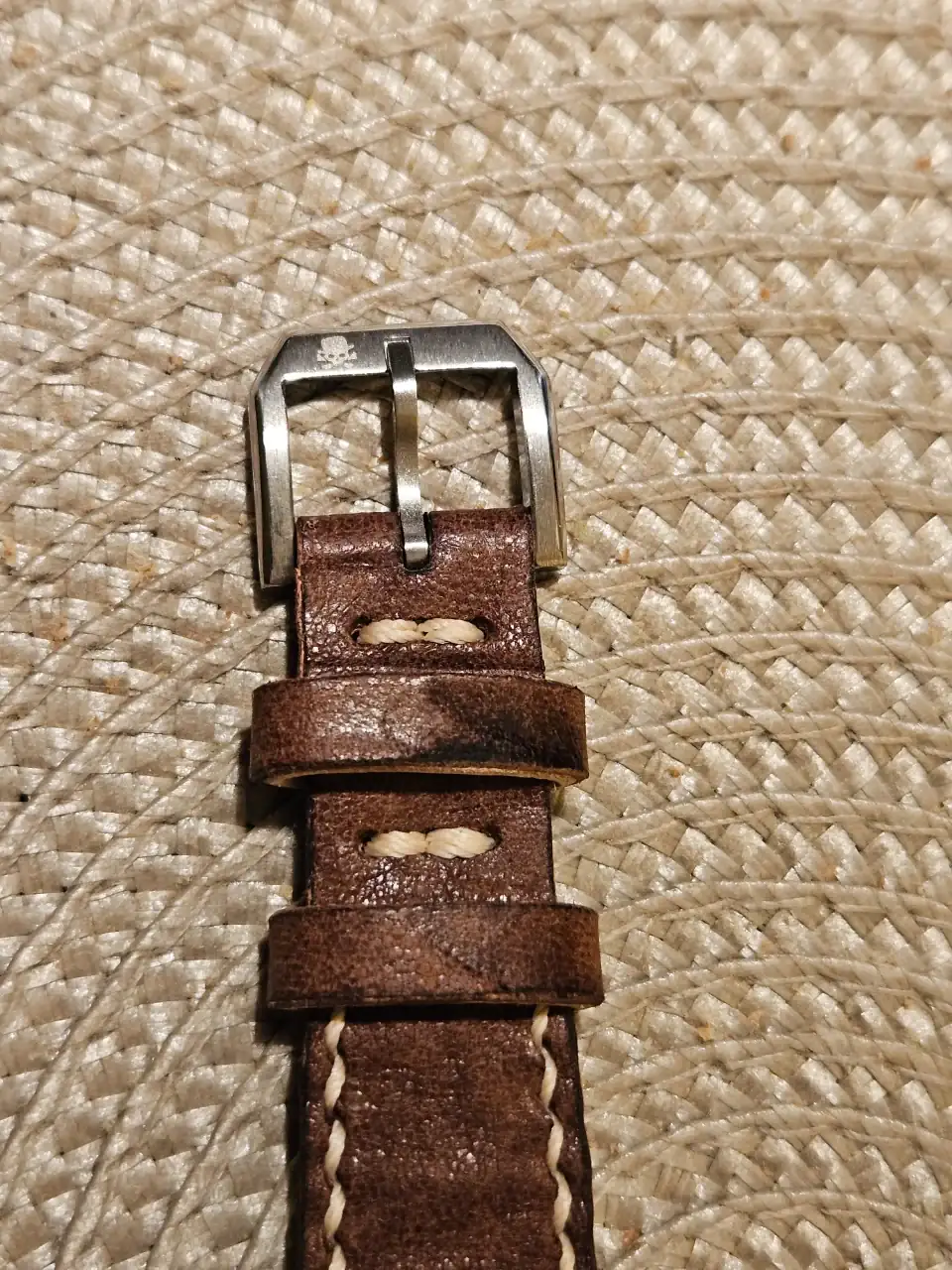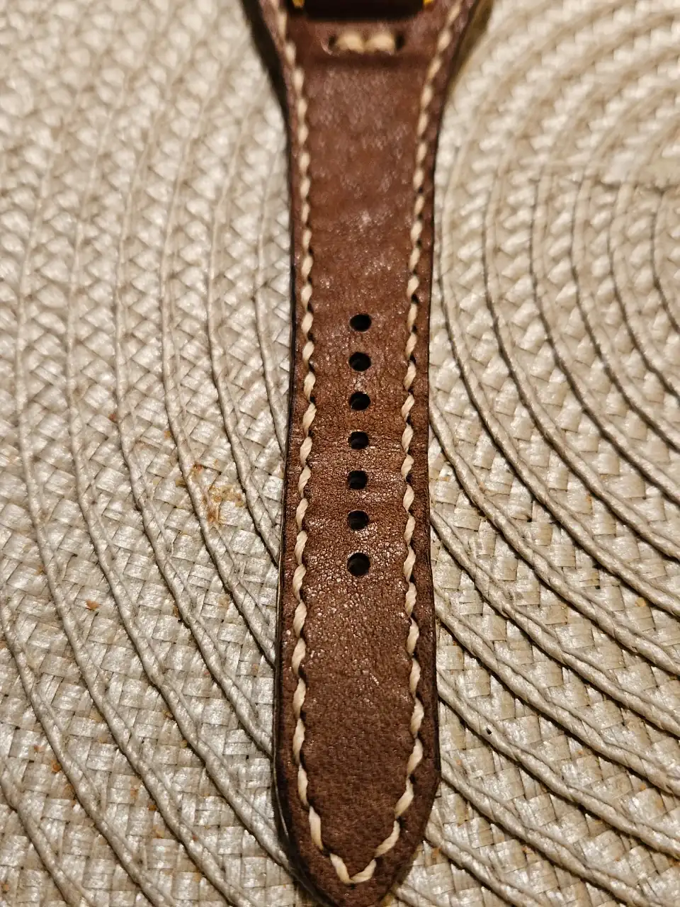 @yandemol) si él tenía pensado algún tipo de correa para el reloj, decidimos que yo le pusiese una para realizar las fotos para este hilo, y que luego él ya se pensaría con calma qué correa ponerle. Por lo tanto creí que lo más correcto era buscar una correa lo más neutra posible, y tratándose de combinarla con un reloj chapado en oro amarillo, creo que nada es más neutro que el negro, así que decidí ponerle una correa de cuero negro con estampado tipo cocodrilo.