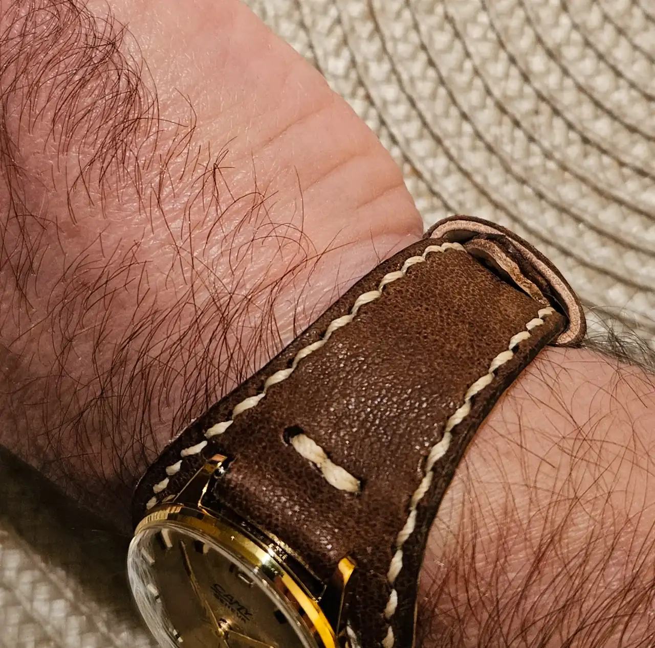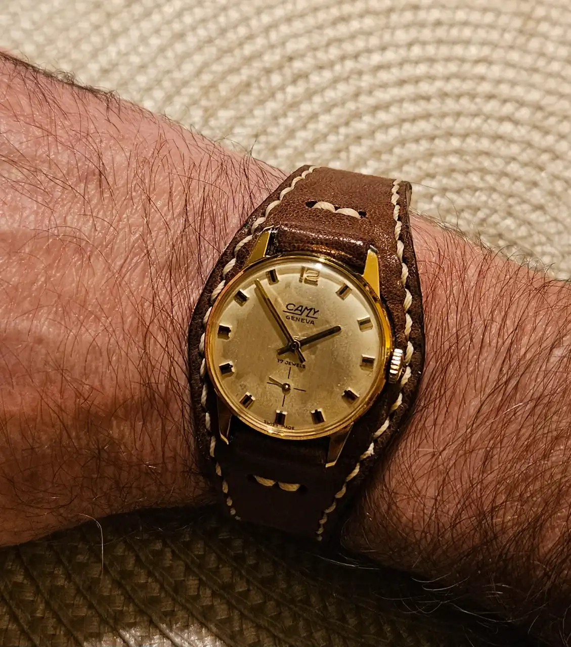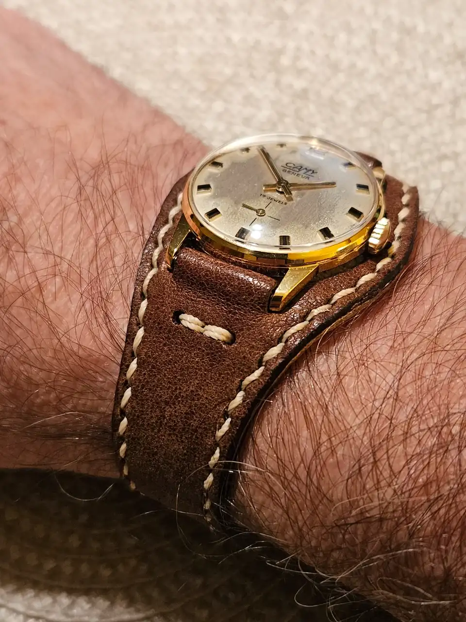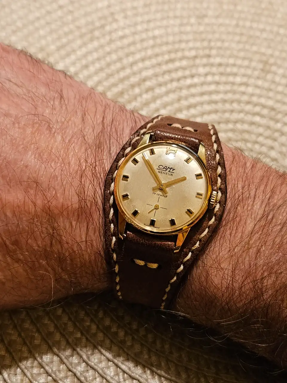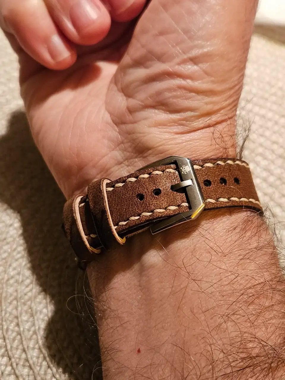 @yandemol) si él tenía pensado algún tipo de correa para el reloj, decidimos que yo le pusiese una para realizar las fotos para este hilo, y que luego él ya se pensaría con calma qué correa ponerle. Por lo tanto creí que lo más correcto era buscar una correa lo más neutra posible, y tratándose de combinarla con un reloj chapado en oro amarillo, creo que nada es más neutro que el negro, así que decidí ponerle una correa de cuero negro con estampado tipo cocodrilo.