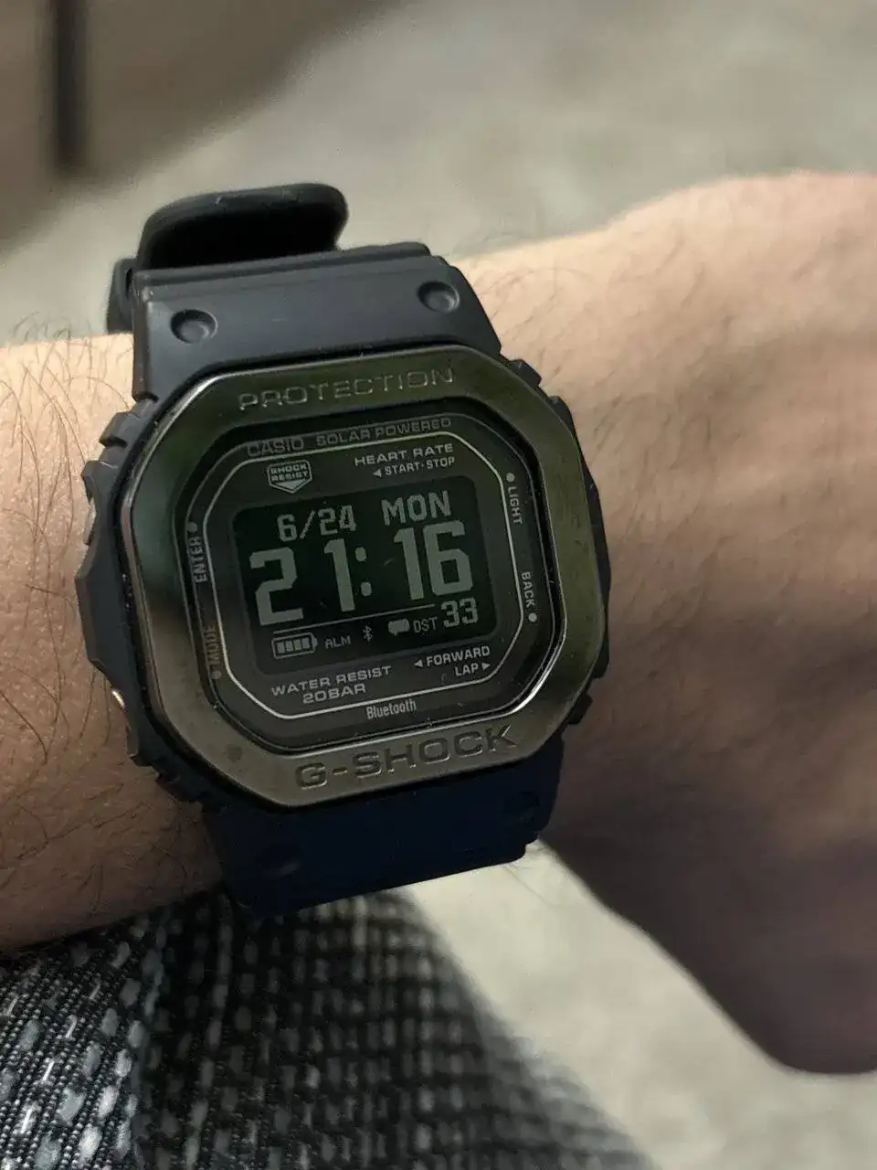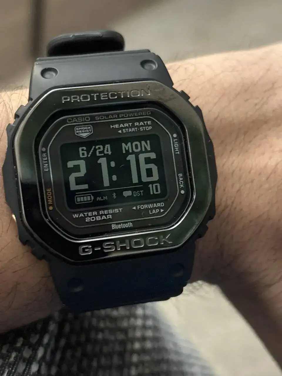 Pero hablemos, primero, del reloj. Aquí poco tengo que decir que no sepáis ya. De calidad va sobrado y de dimensiones es similar al DW-5600, aunque creo que más alto, al tener sensores biométricos en su parte trasera. Los sensores (que yo no uso), son, en teoría, firmados por Polar; pero como yo sólo los he usado una vez, atraído por la curiosidad de lo novedoso, poco puedo decir de ellos. Eso sí, tened en cuenta que su uso puede afectar bastante a la batería. Respecto al resto de complicaciones inteligentes: no son nada del otro mundo (probablemente un Suunto o un Polar o un reloj de alguna compañía diseñado específicamente para esas funciones sea más preciso; pero tampoco son excesivamente fallones; es decir, dan estimaciones certeras para alguien que no sea un obsesivo-compulsivo de la exactitud y sea capaz de entender que tendrán un grado de error más o menos alto comparado con un reloj pensado para la función específica que se quiera); pero eso le pasa también al GBD. La pantalla, por su parte, es una maravilla. Sólo tengo otra negativa en mi colección (un Skmei que no se ve mal) y esta le da mil vueltas: se ve genial, en casi cualquier ángulo y bajo cualquier condición lumínica (por la noche, su luz se activa automáticamente al girar la muñeca, aunque esto puede desactivarse).