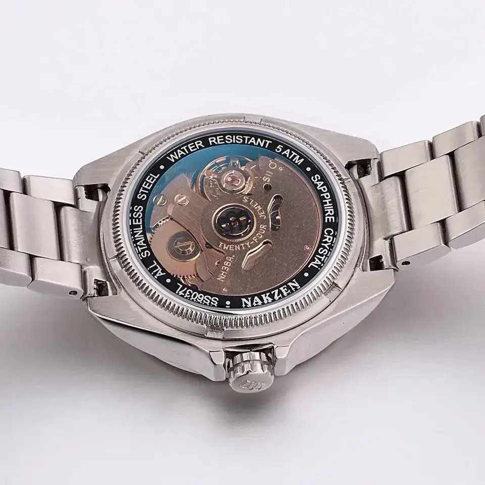 Yo tengo ese reservado,con un calibre miyota,zafiro y resistente al agua 5atm.