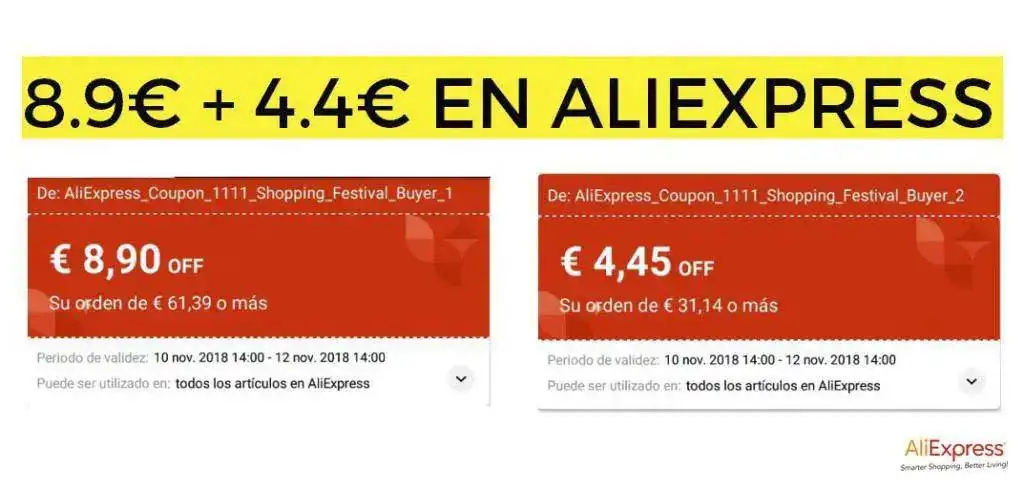 - Aliexpress ha sacado para la promoción del 11.11 cupones por valor de 3,6€ y 4,5€, que se pueden conseguir de la siguiente manera: