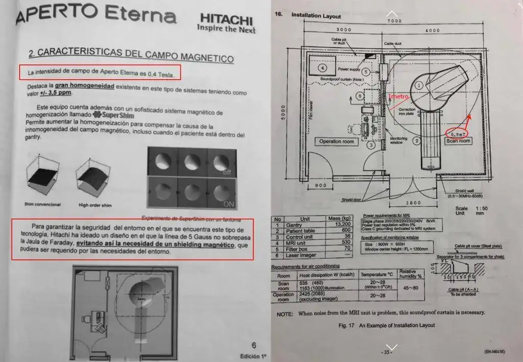 Entonces me he ido a las especificaciones de una resonancia que tenemos instalada en uno de nuestros centros. Y lo que me he encontrado es sumamente interesante. En el dibujo siguiente podemos observar que existe una línea de 5Gauss o 5mT (5 mili Tesla = 0,005T) que es el campo magnético mínimo que ha de encontrarse dentro de la habitación para que no afecte a los objetos del exterior, y