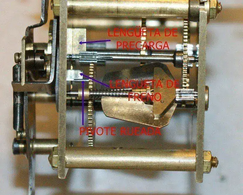 A continuación vemos las palancas más importantes que componen la parte de conteo de las horas. El rastrillo es la parte más curiosa y elegante (diría yo) del mecanismo, su funcionamiento es el siguiente, una vez disparado y por la gravedad cae sobre el caracol que es una rueda solidaria al caños de horas y que tiene doce saltos o peldaños, correspondiendo cada una a una hora. Mediante el tope se mantiene en una posición simétrica a la posición del rastrillo y su eje de conteo. La rueda con el pivote de arrastre del rastrillo, lo que hace es mover una posición los dientes cada toque y la palanca de antiretorno impide que mientras el pivote no sujeta el diente, el rastrillo retroceda hasta su posición inicial. Una vez que ha llegado al final el rastrillo, la palanca antiretorno y freno, se encarga de para la rueda intermedia de control de horas, y parar todo el tren de sonería de horas.