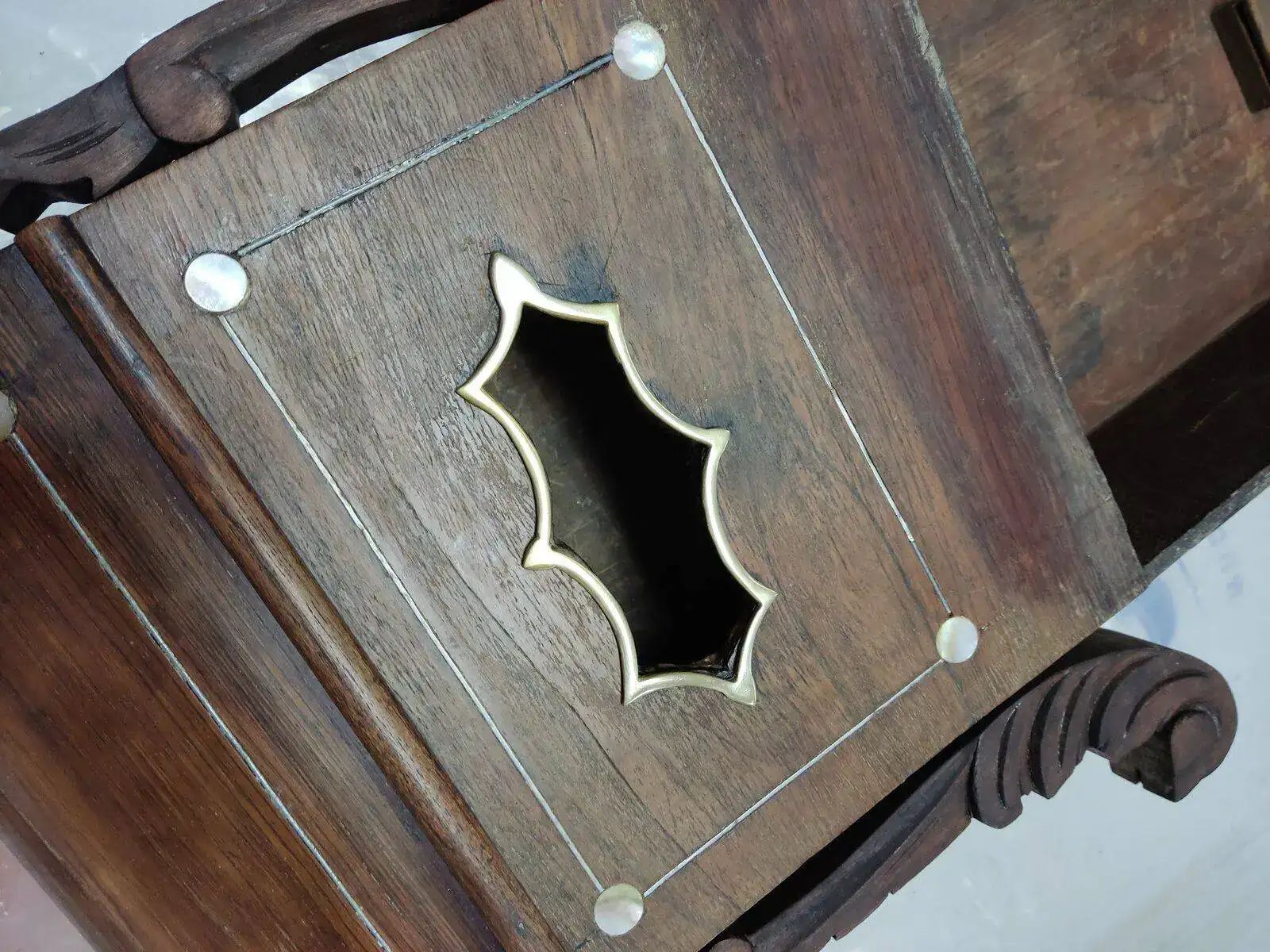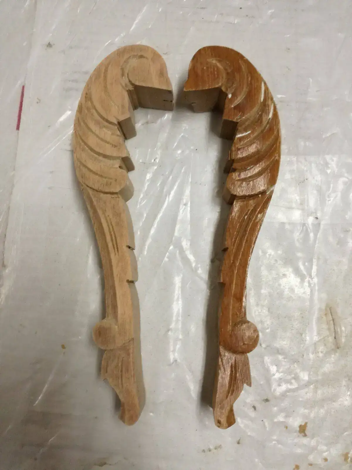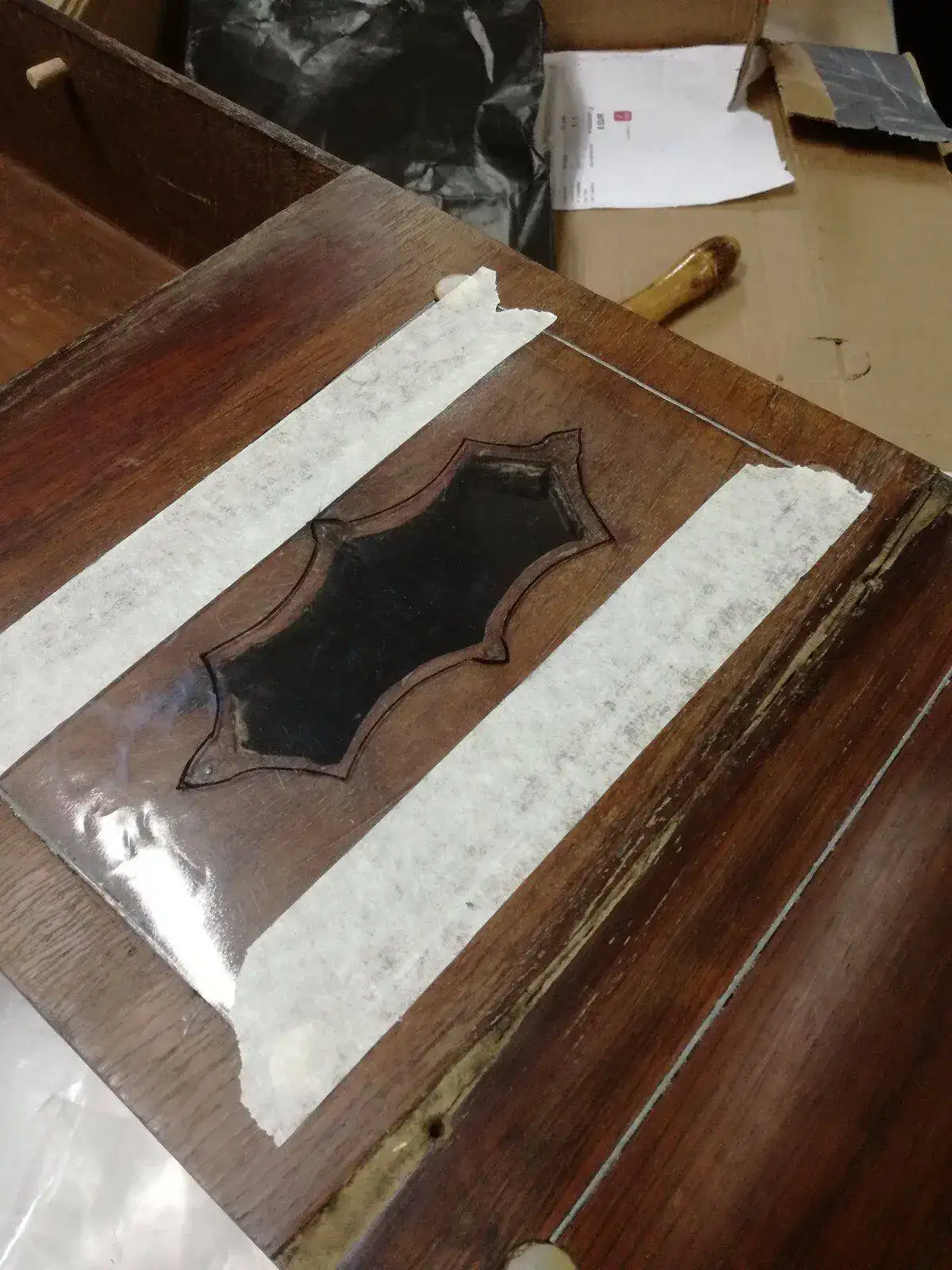 La solución llegó a partir de restos de una antigua mesilla, cuyos adornos se habían salvado de la quema. Después de probar algunos opté por los que por tamaño mejor le iban. Retiré el barniz y empaté el color con el de la caja con una dilución de nogalina.