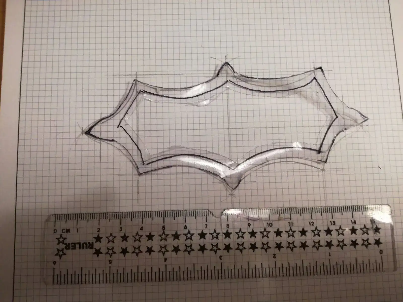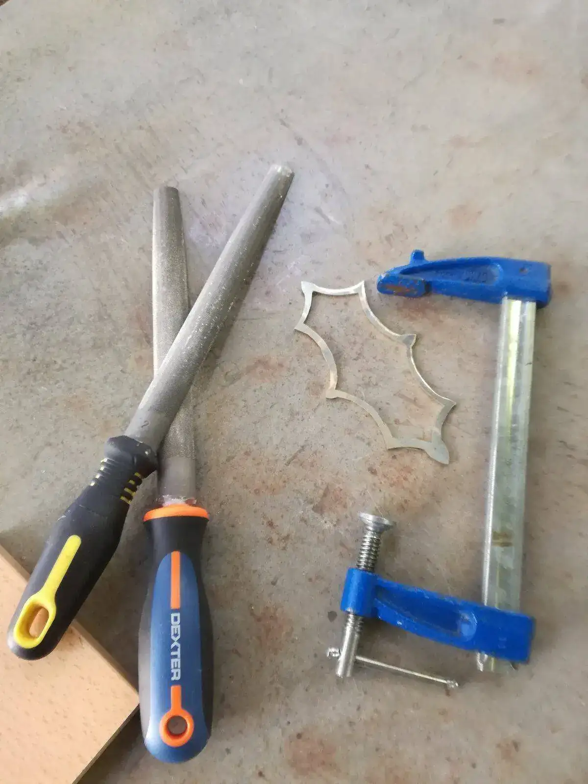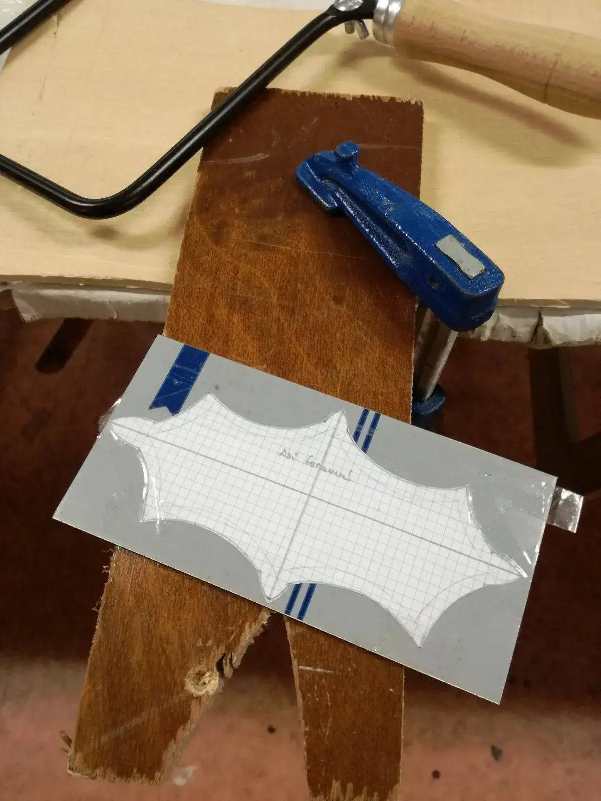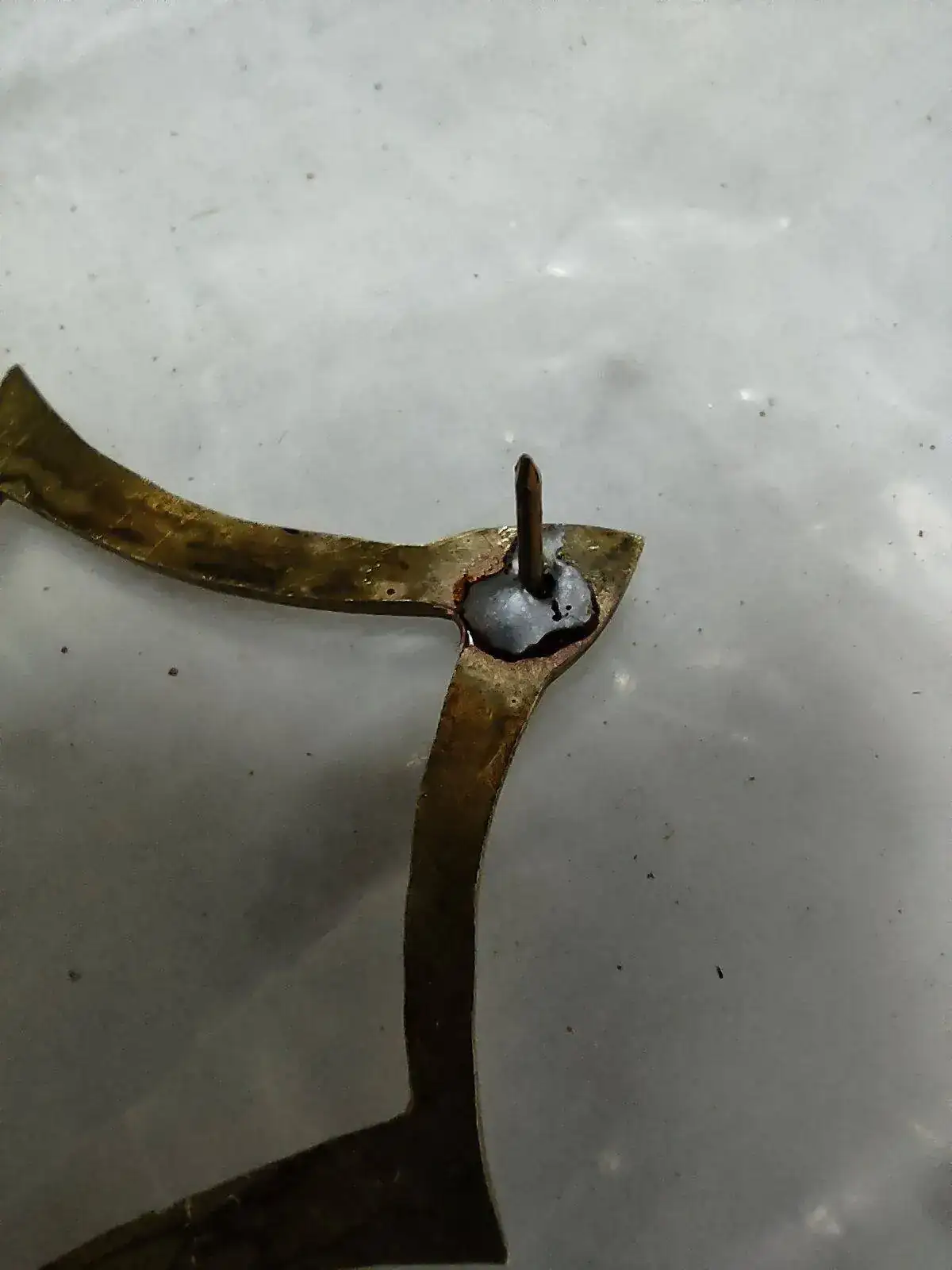 Lo hice a partir de una plancha de latón a la que recorté un bisel con segueta. Luego limas para redondear y soldé unos clavos de latón.