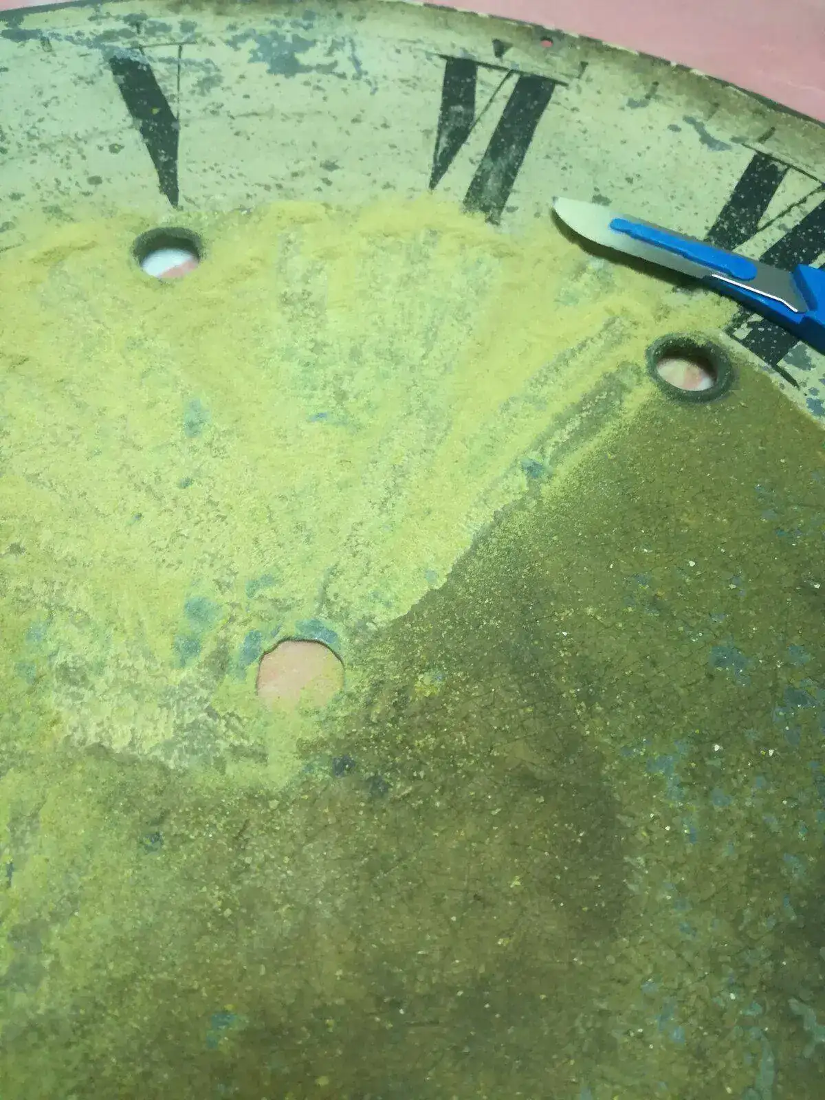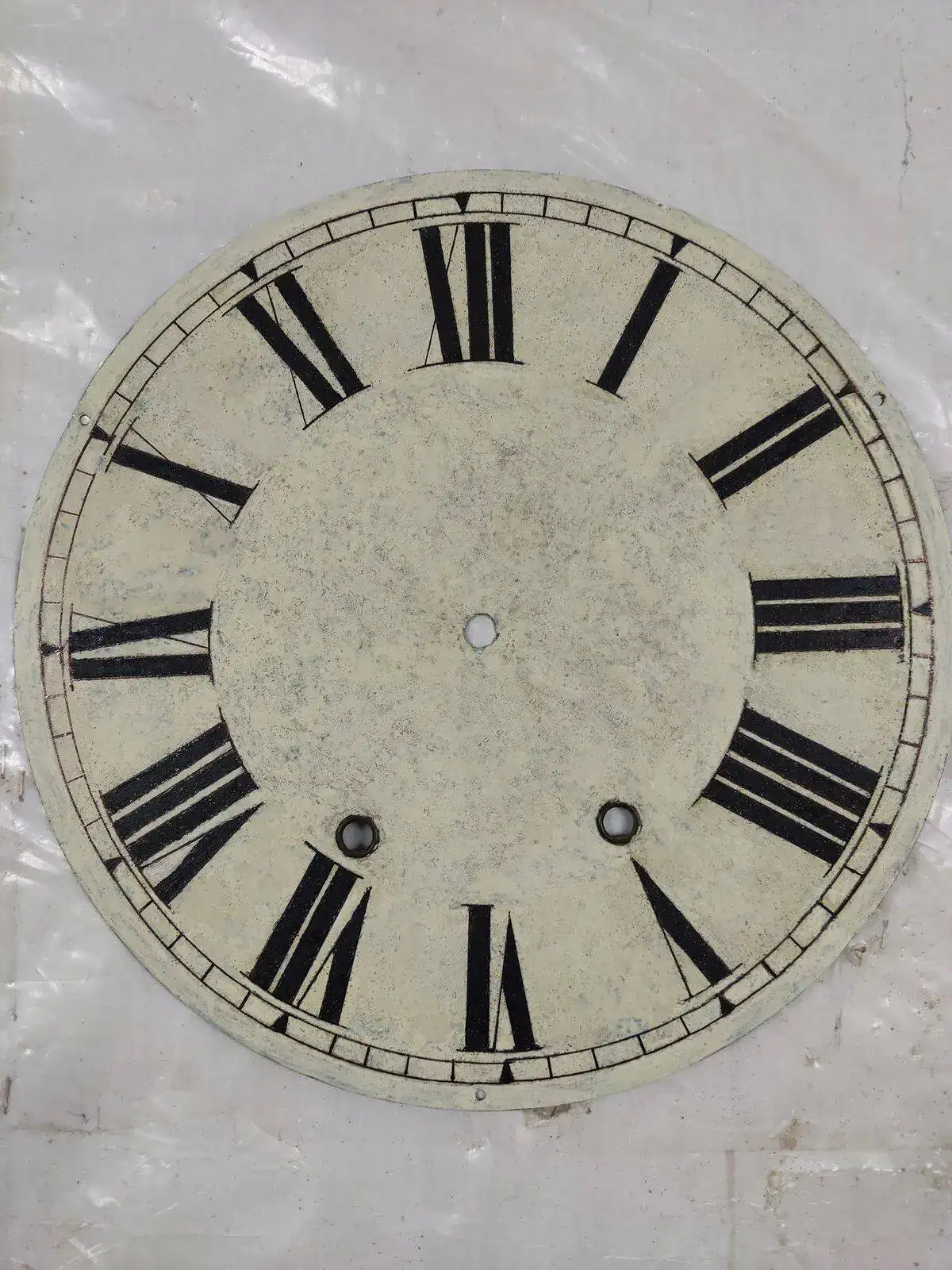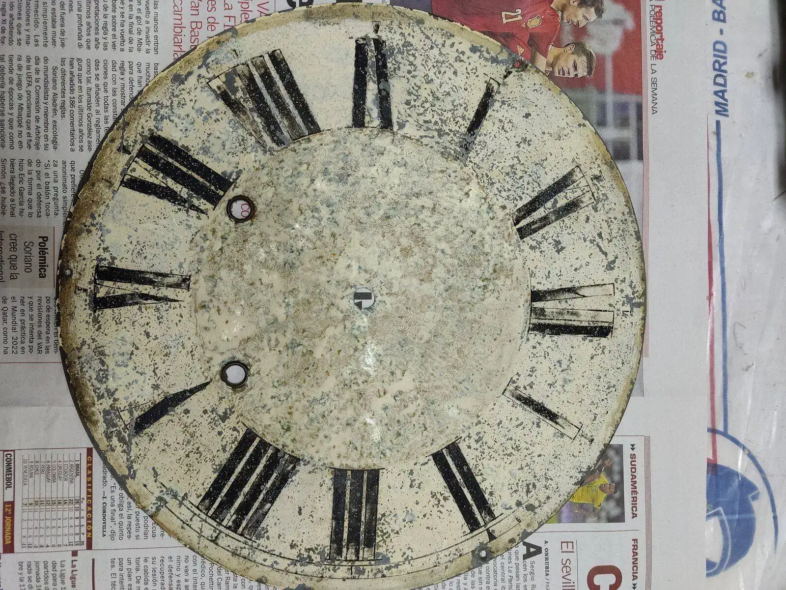 Presentaba numerosos desconchones y el centro de la esfera tenía un repinte amarillo que era alguna mala decisión de restauración en el pasado. Esa pintura amarilla añadida la retiré con bisturí y realicé un repintado con acuarela de toda la esfera, incluidos los números. Previa limpieza que retiró bastante suciedad. Solo en la restauración de líneas utilicé rotuladores indelebles. Tras ello di una muy pequeña capa de barniz acrílico para proteger el repintado de acuarela. Traté con todo ello de respetar la antigüedad y la esfera original. No quería una esfera nueva.