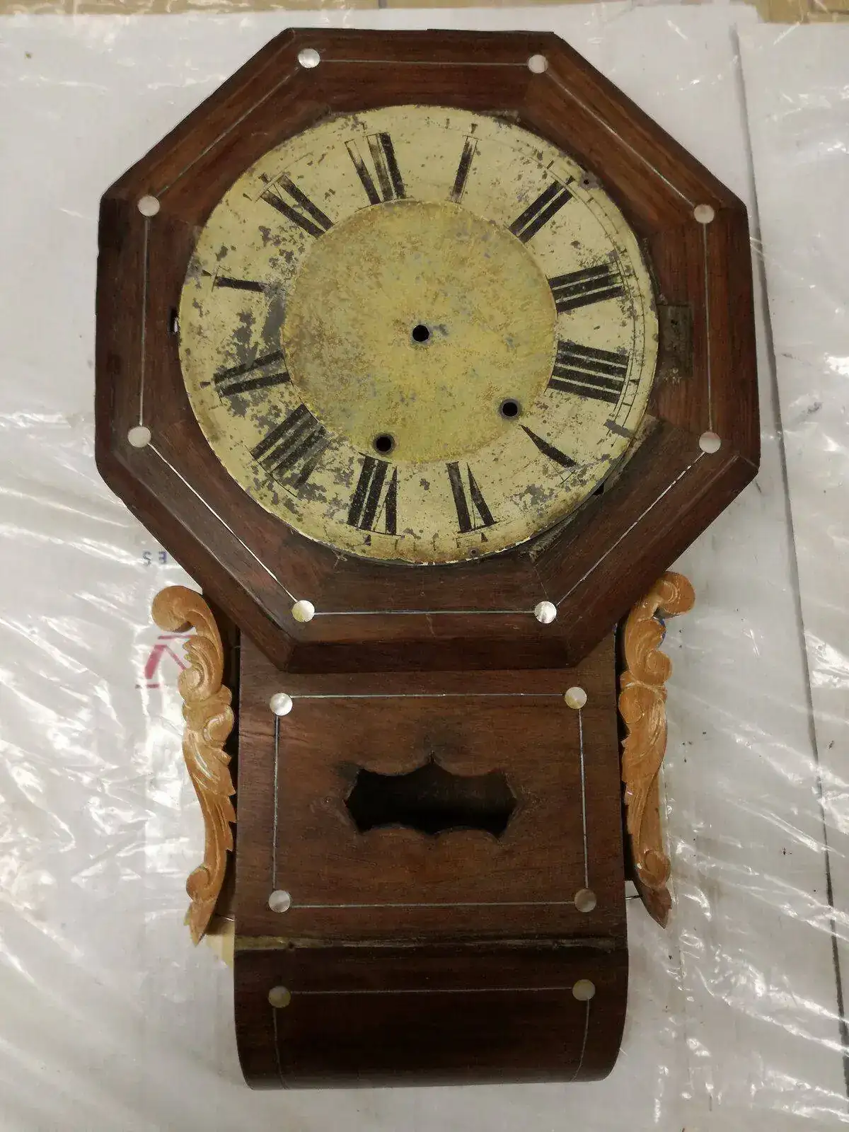 Este tipo de relojes adornaban la caja principal con piezas de madera con motivos variados (uvas, brotes vegetales, adornos simétricos). En este caso no pude localizar ningún clon exacto del reloj, pero si que se apreciaba que en ambos laterales había restos de la inserción de estos adornos.