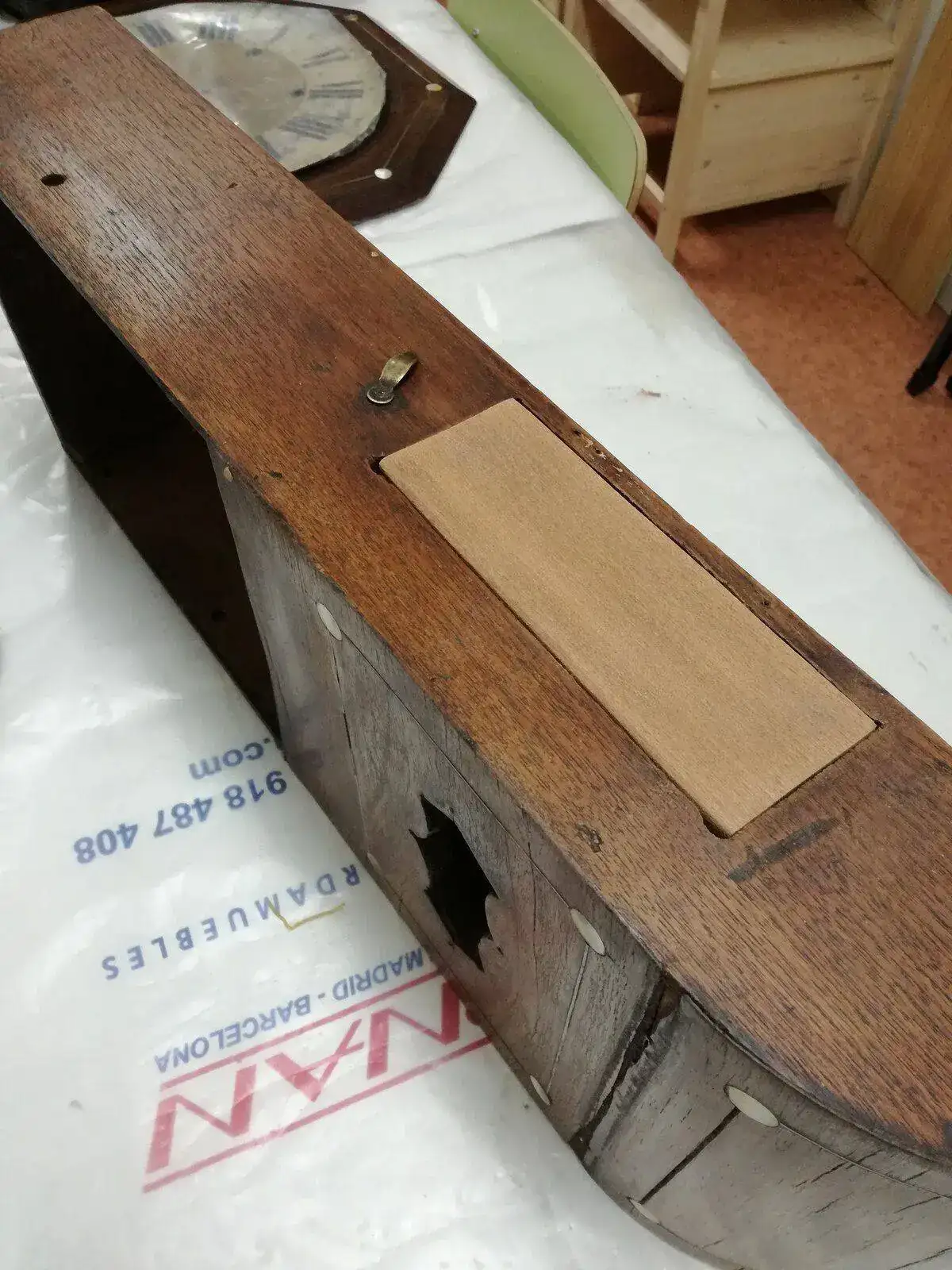 A la caja le faltaban bastantes elementos, la puerta lateral, el bisel frontal y cristal, adornos en madera laterales y bisel de la ventana del péndulo. Además de alguna que otra rotura de piezas.