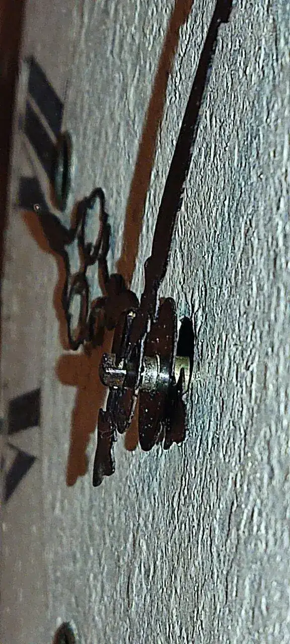 El péndulo no es el que llevan este tipo de relojes, que suelen ser de lenteja sin relieves. Pero es el que tenía a mano y de momento se queda. Lo adapté con un gancho que si te fijas es el extremo de la pieza metálica de un archivador A-Z.
