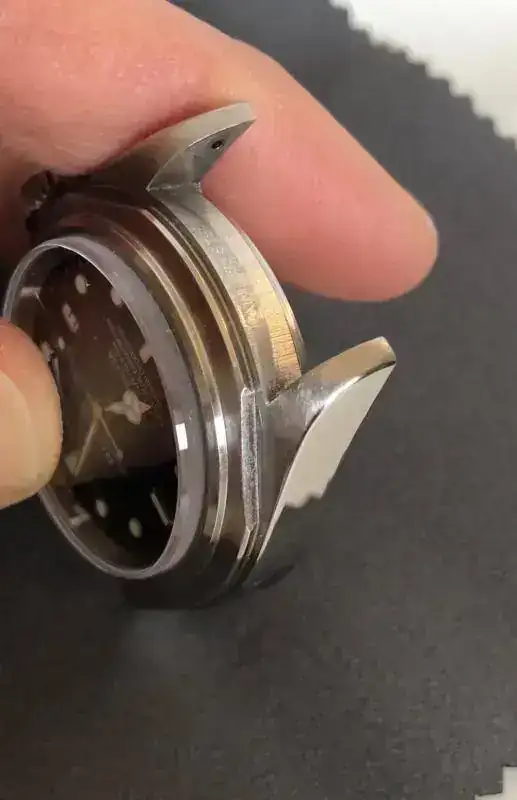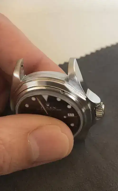 La restauración consistía en hacerle un lavado de cara a este reloj que no estaba mal en las zonas pulidas pero que las asas estaban redondeadas completamente con algún piquete y sin biselado ni geometría ...... así pues soldadura láser , mismo acero siempre (importantísimo) , conformar soldadura y hacer geometría de nuevo haciendo su biselado original ( cada modelo de Rolex lleva uno distinto ). Solo hacer el biselado me ha llevado dias ....pero el resultado habla por si solo.