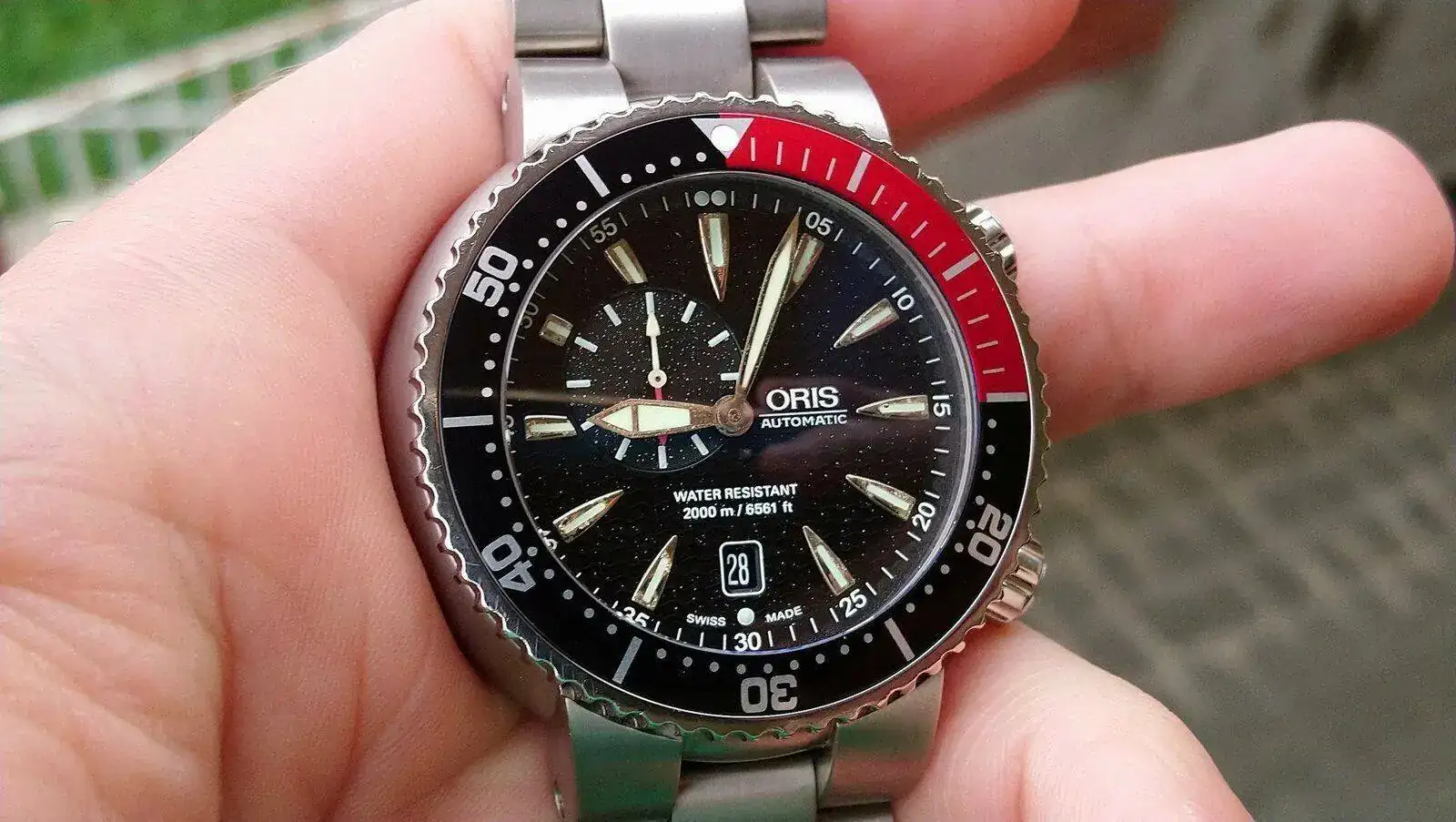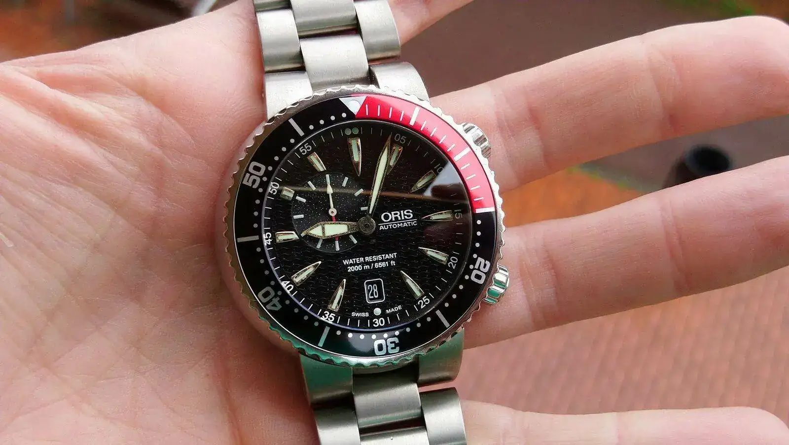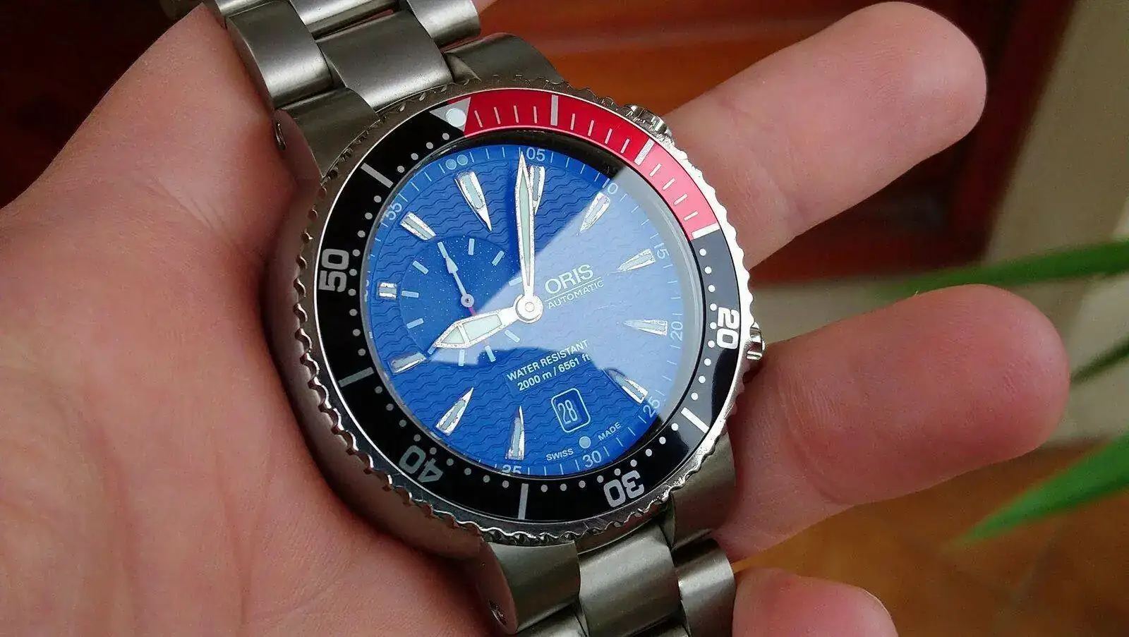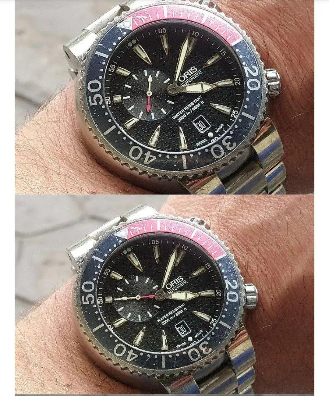 Asimismo las agujas e indices habian perdido parte del dorado debido a que le entró algo de humedad. Eso si, el funcionamiento era correcto, incluso lo llegué a usar en la piscina!