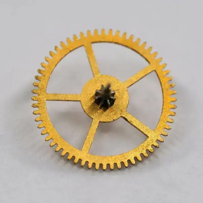 La siguiente figura muestra la cuarta rueda y el piñón del movimiento Pobeda, que tienen 60 dientes y 8 hojas, respectivamente.