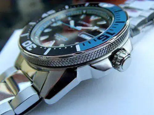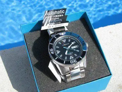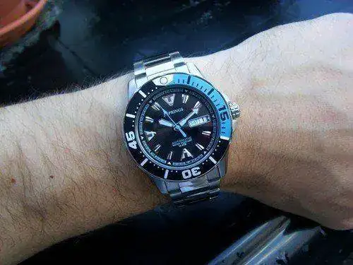 que después de investigar un poco es una filial de Seiko para el mercado americano. Utiliza los calibres automáticos y de cuarzo básicos de Seiko. El precio era muy, muy, muy razonable (con gastos de envio salió por 71 €) y compre uno para añadir a mi colección de automáticos junto con el Orient Mako I azul y el Seiko 007. Y ahora detalle del reloj.
