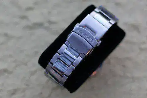 La pulsera es para mi lo peor del reloj, no por la calidad que es muy correcta sino por la decoración. Es de eslabones de acero estampado y hueco, bien acabada, con el cierre típico de los divers excepto que no tiene extensión para neopreno, cierre de seguridad y el acabado es en acero mate por los lados y en el centro acero pulido muy brillante al estilo americano tan dados ellos al cromado.