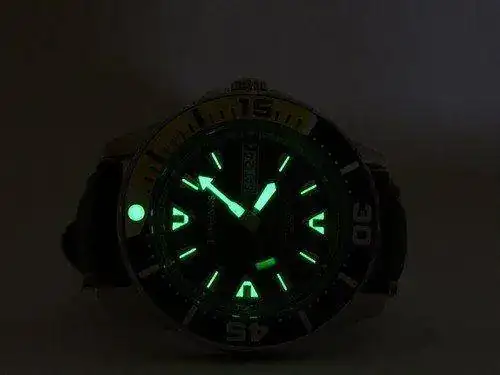 Las agujas son grandes y la de los minutos en forma de flecha me encanta, van recubiertas de lumen que la marca llama newbrite y que no llega al nivel de seiko 007, pero que es correcto, a la altura del Orient Mako I.