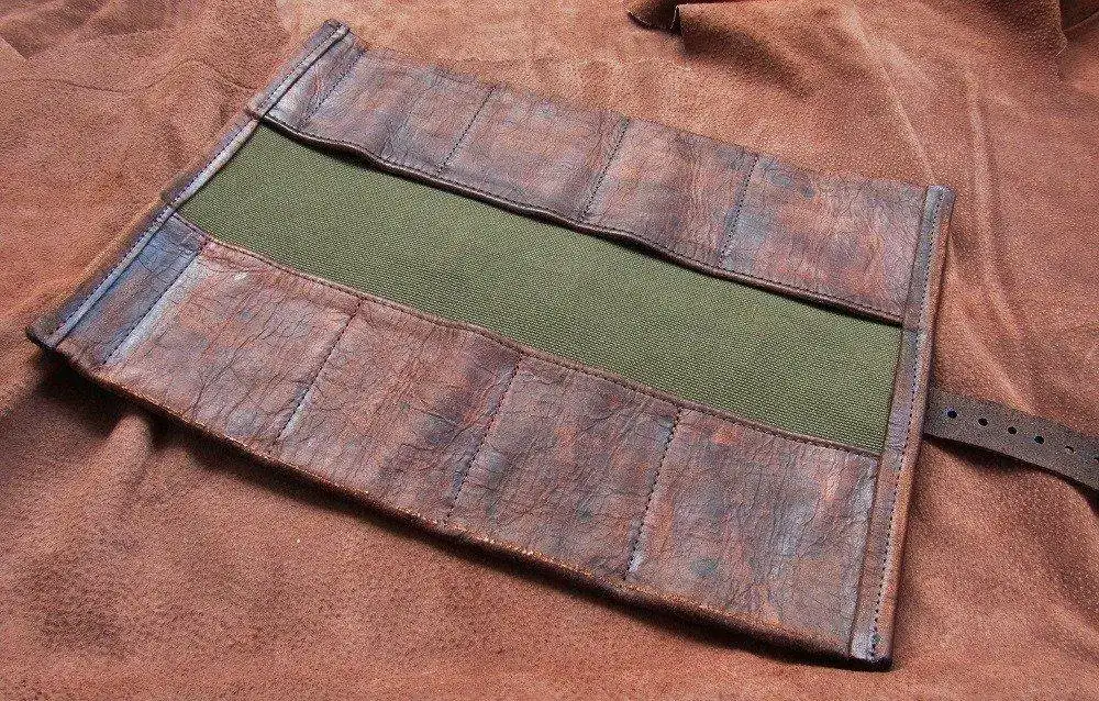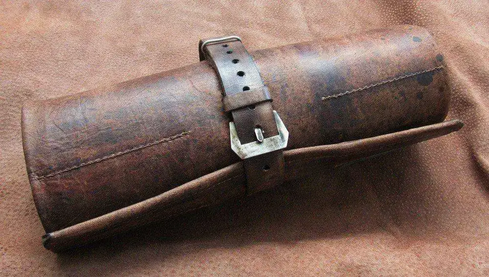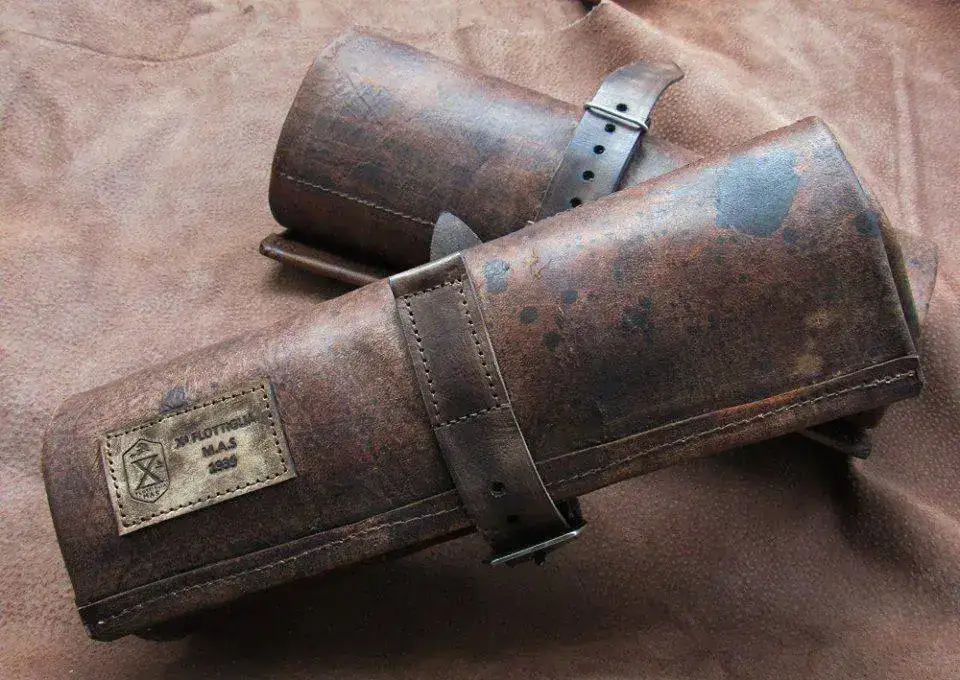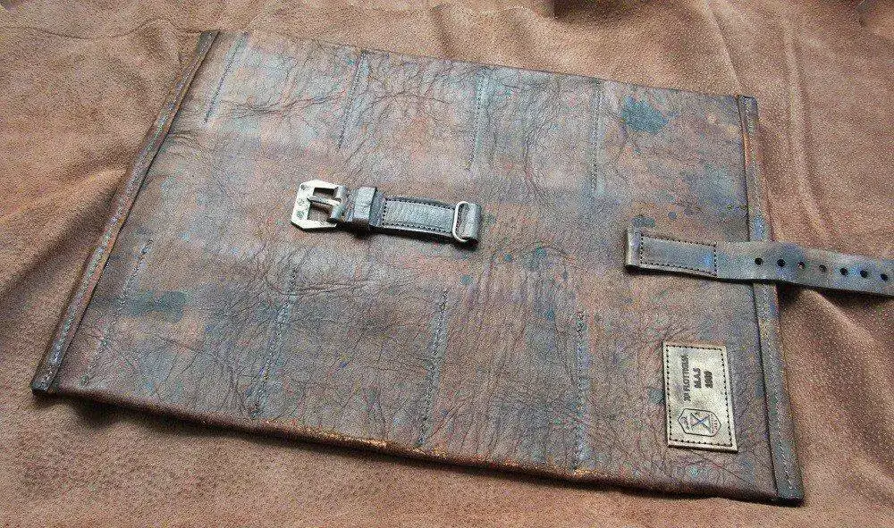 Como podéis ver, está fabricado con un acabado envejecido en su totalidad. Y aquí es dónde me gustaría hacer una mención especial al trabajo de C&B. El estuche parece recién rescatado de una trinchera. El diseño mezcla partes tintadas, bordes descoloridos, bordes rasgados y costuras envejecidas, todo ello sin quitarle un ápice de presencia, elegancia y finura. Una auténtica pasada, os lo aseguro. Os dejo con unas fotos de los detalles: