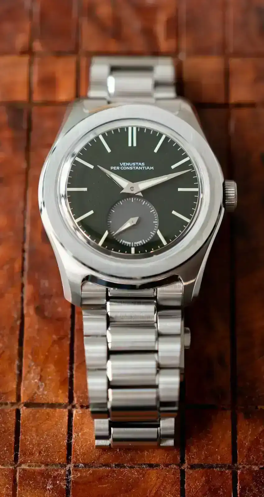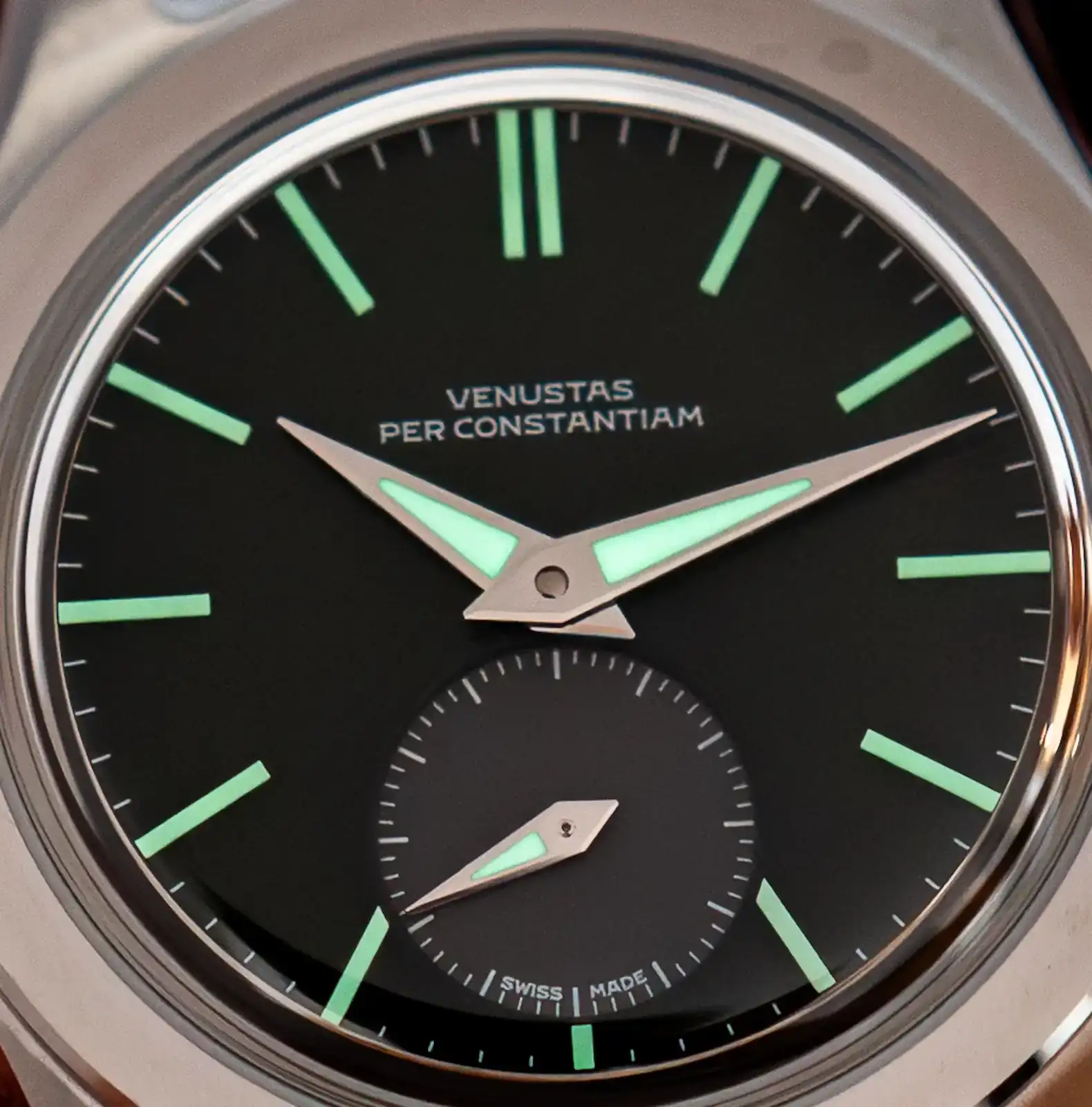 El nombre de la marca, Venustas Per Constantiam –“belleza a través de la constancia” en latín–, aparece discretamente en la esfera, un detalle que me parece un acierto. No es un logo que busque imponerse, sino un recordatorio sutil del esfuerzo detrás de este proyecto.