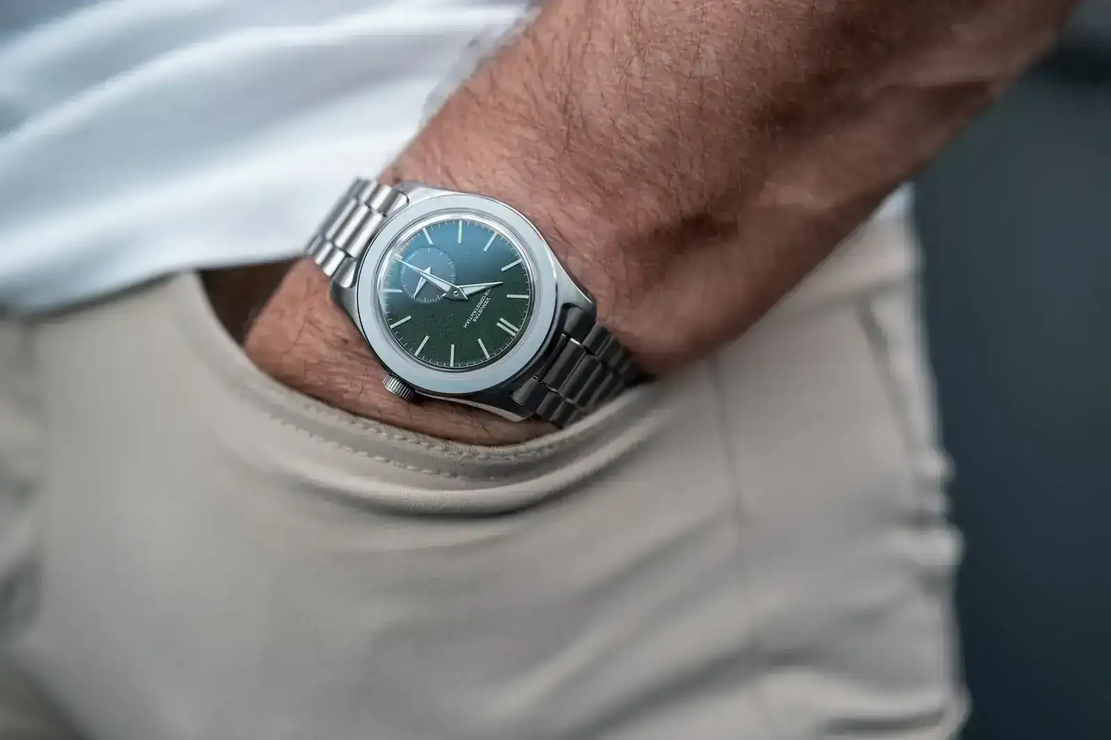 VPC ofrece tres opciones: Dove Grey, Delft Blue y Forest Green. Como ya tengo varios relojes con esfera azul en mi colección, descarté el Delft Blue para no repetir y que tuviera que competir con demasiados candidatos. Aún así, la decisión entre el gris y el verde seguía siendo complicada; ambos son elegantes y versátiles. Finalmente, me decanté por el Forest Green porque, aunque el verde es un color que me encanta, me resulta difícil encontrar relojes que lo exhiban como me gusta a mí. Esta esfera, que oscila entre un verde oscuro en penumbra y un tono cálido y vibrante bajo la luz, es hipnótica. Su textura finamente granulada juega con la luz de forma espectacular, cambiando según el ángulo de incidencia y dotando al reloj de una personalidad viva que nunca aburre.