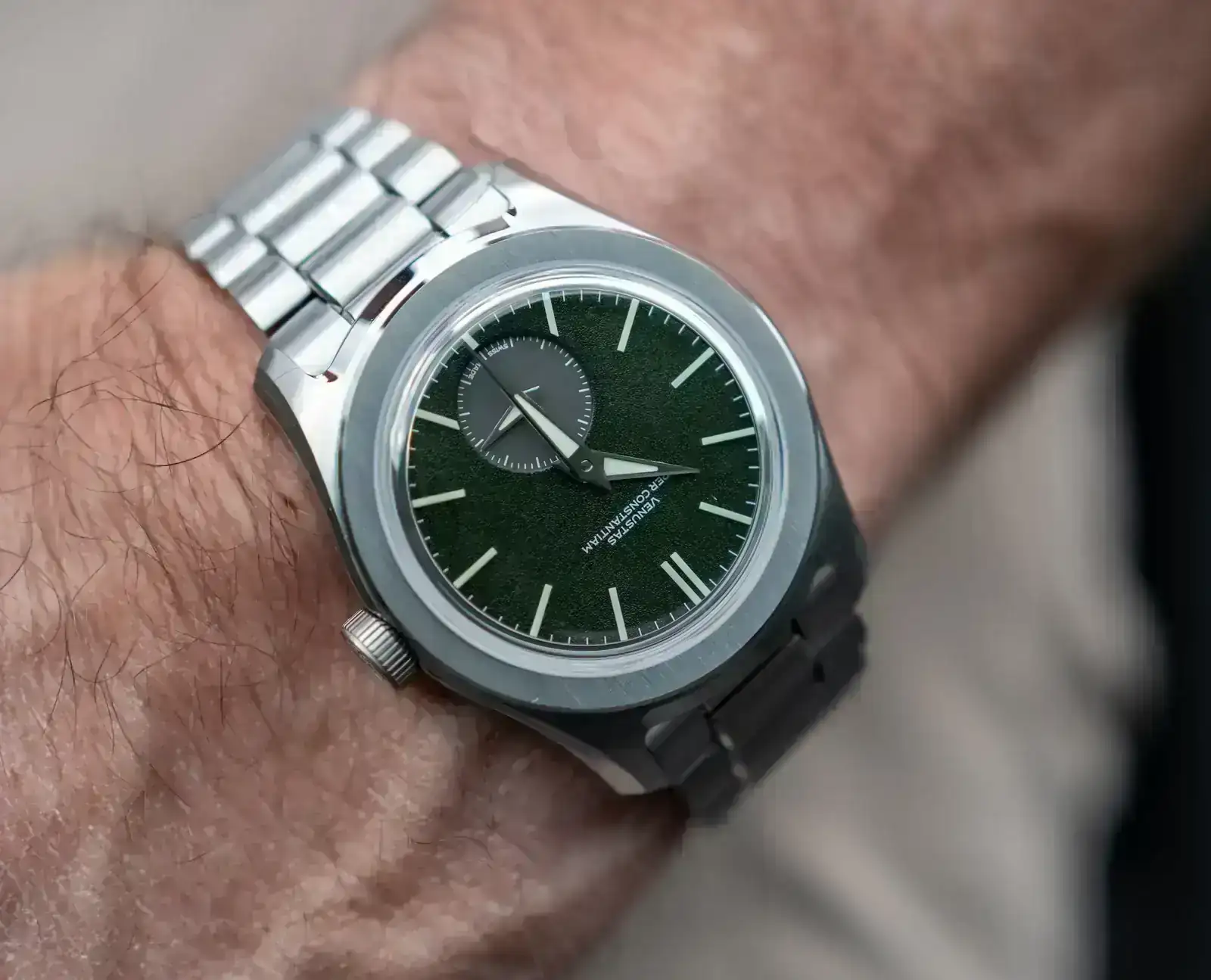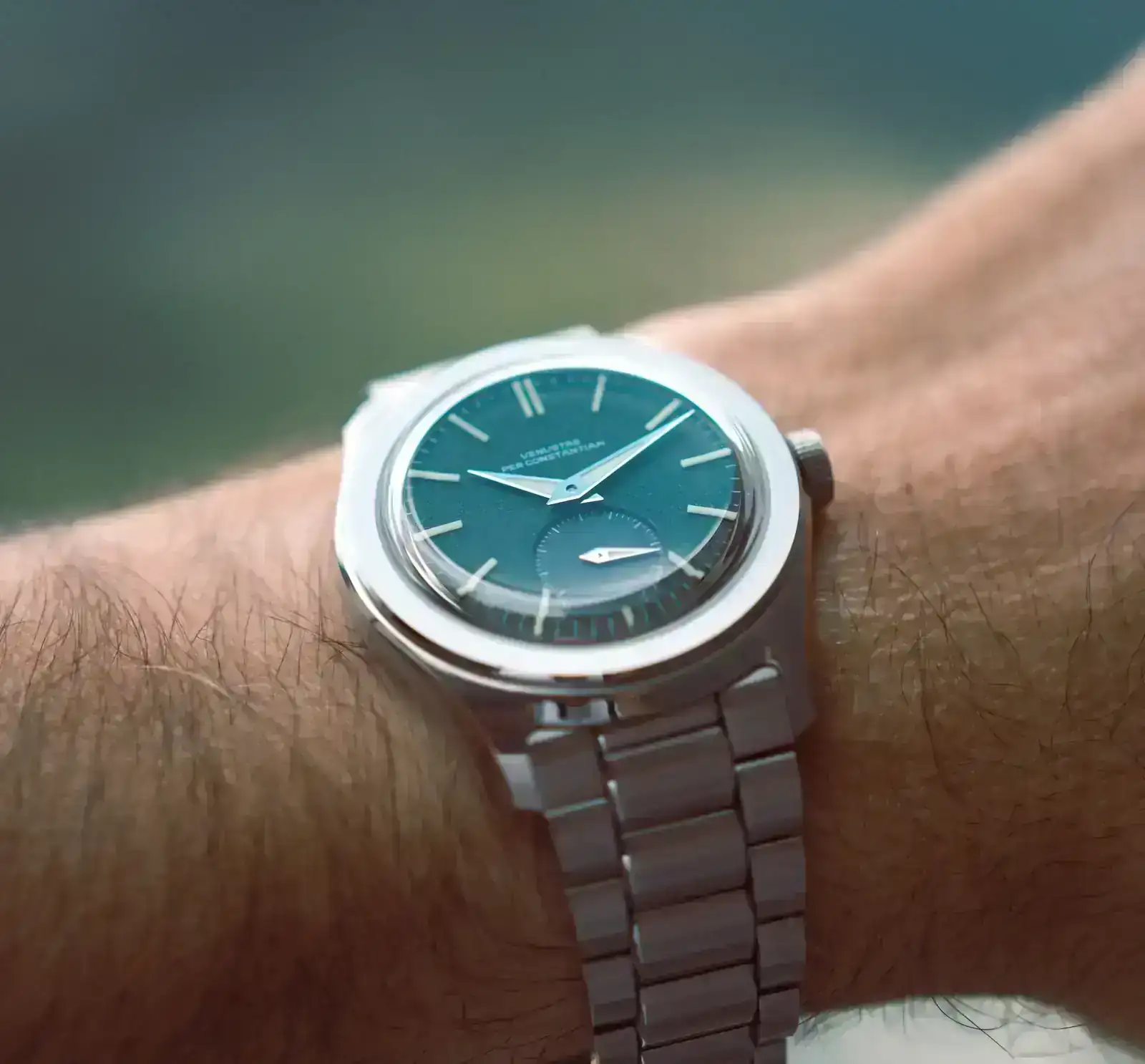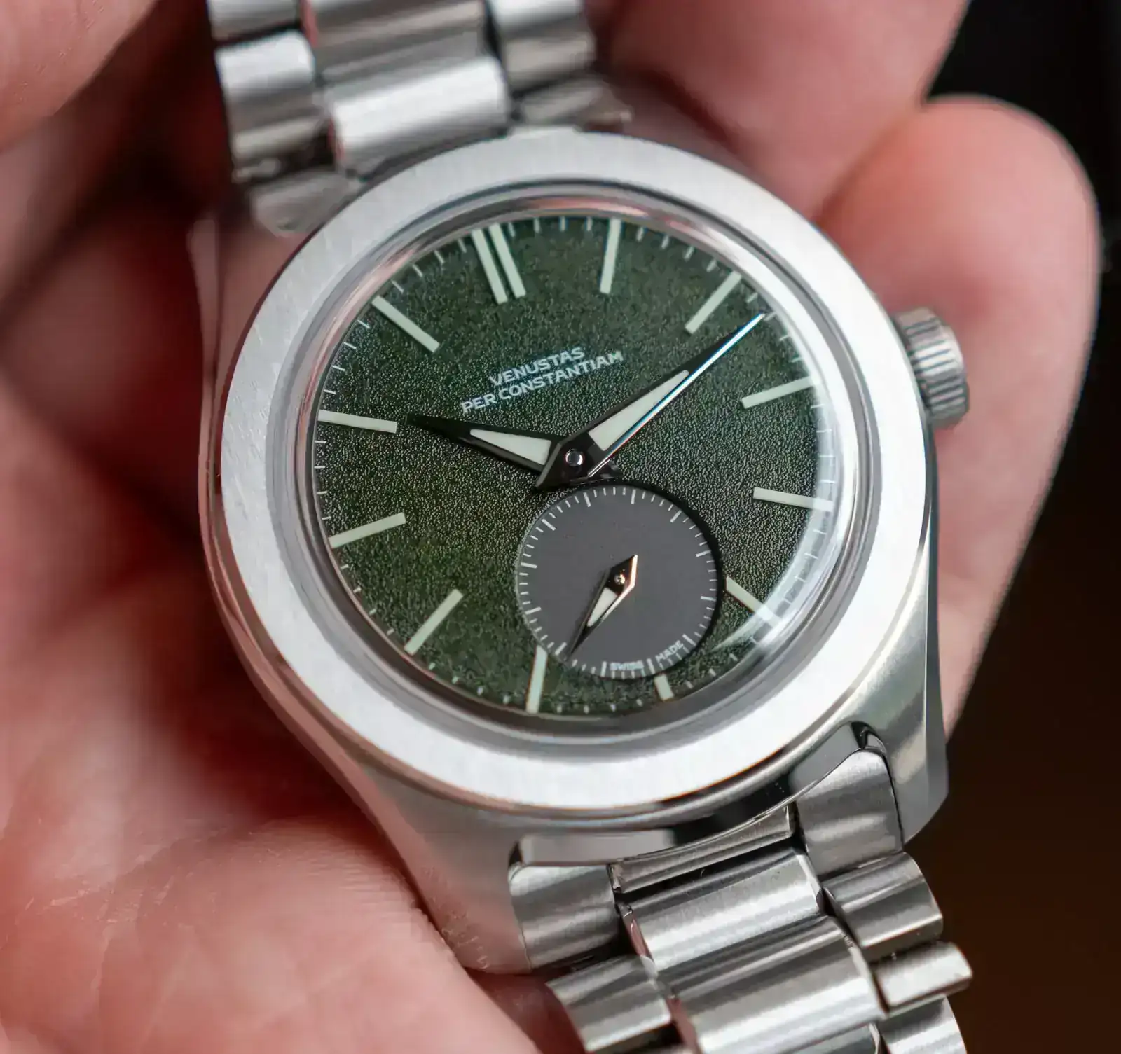 - Esfera: Verde bosque con textura granulada, subdial antracita a las seis, índices de lume C3, tipografía “Venustas” diseñada por Samuel Baker.