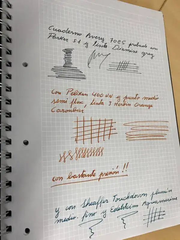 En en todos los casos, la escritura es muy suave y fluída, sin interrumpir el flujo en ningún caso. Incluso la Pelikan, que por su plumín en según qué tipo de papel tiene tendencia a "rascar", se comporta perfectamente.