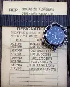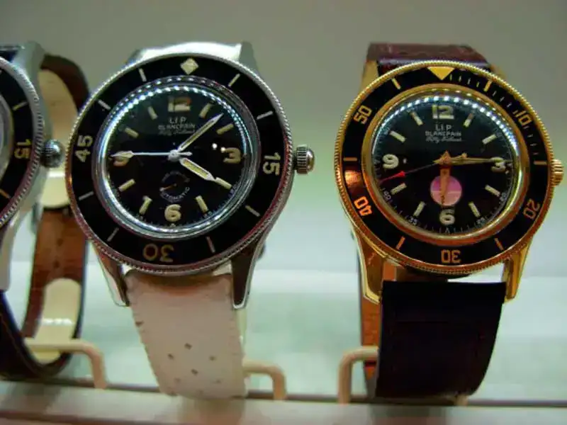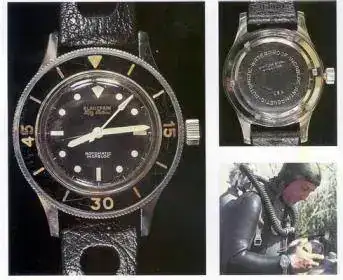 Para una correcta coordinación y ejecución de las operaciones, consideraba obligatorio usar un reloj-herramienta, pero no encontró ninguno del momento que cubriera todas las necesidades. Se propuso a la manufactura francesa, LIP, que desarrollará uno, y esta entrego un prototipo de 35mm, con baño de oro y un enorme Plexi en cúpula. Maloubier comentó que el tenía un diseño de un reloj más grande, con dial negro y máximo lumen, y que incorporaba un bisel giratorio para recoger los tiempos de buceo. LIP concluyo que dichas ideas no tendrían éxito y desistió de elaborarlo (ejemplo de error histórico). Entonces Maloubier contacto con una pequeña relojera : “Rayville S.A. successeur de Blancpain”, que tras la crisis de los 30, únicamente fabricaba calibres para otras empresas como Gruen, Elgin o Hamilton. Contacto con ellos porque su CEO, Jean.jaques Fietcher, era un buzo aficionado que estaba intentando crear un reloj de buceo. Juntos desarrollaron en 1953 el que todos consideramos como el primer reloj diver : Blancpain Fifty Fathoms (50 brazas, 90,45m, era la profundidad máxima tolerada). Este reloj usaba un calibre A. Schild 1361, tenía alta visibilidad, caja de 41mm (enorme para la época), Tapa de 3 piezas, bisel giratorio unidioreccional con bloqueo y correa Apollo Tropic. Este fue el camino para que Blancpain volviera a fabricar sus propios modelos. Estos BP FF se adquirieron como dotación de esos primeros comandos de buzos de combate de la MN, y después se suministrarían a otras fuerzas militares, como los famosos BP FF “Mil Spec” para los UDT de la US Navy, que incorporan otra novedad diseñada por J.J. Fietcher, el sensor de humedad en el dial que alerta de la entrada de agua al interior del reloj. LIP que había cometido el error de no fabricarlo si tuvo el acierto de comercializarlo bajo su marca o bien bajo “La Spirotechnique”, marca pionera de equipamiento de buceo. A fecha de hoy este es mi “grial” y tendremos que conformarnos con estas fotos de la red.