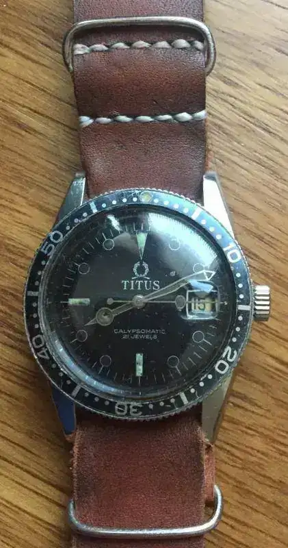 Mi ejemplar es un Titus Calyopsomatic de 1963, ref. 7085 con dial gilt y corona grande; que aunque ha perdido parte de su lumen sigue mostrando un aspecto fantástico de autentico “diver vintage”.