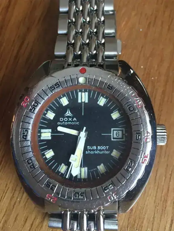 Mi ejemplar mostrado es un modelo original de 1970 : Doxa Sub 300T Sharkhunter, el elegido por el Comandante Cousteau durante muchas de sus inmersiones y completado con al armis "grano de arroz" típico de los Doxa.