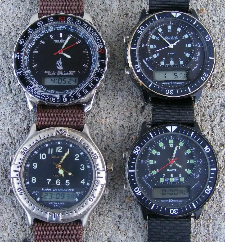 De la marca no tengo ni idea, pero el calibre creo que es un miyota 4800. Lo he adivinado por la disposición de los botones.