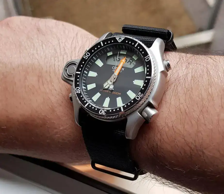 El siguiente avance surge en 1985, cuando la empresa CITIZEN desarrolla el calibre 0023 "Sport Depth Meter AQUALAND", primer reloj con profundímetro electrónico/digital. Esta empresa ya había demostrado su carácter innovador entre los diver, cuando en 1981 presento su reloj 1300m Professional Diver´s watch, récord para uso publico en ese momento. Este reloj fué una auténtica revolución, incorpora un profundímetro fiable hasta 80m, calcula tiempos de buceo para hasta 4 inmersiones consecutivas, incorpora alarma para avisos, reloj digital y analógico o alarma de baja baterías (pues usaba 3 pilas). Este fué el autentico "Diver" a finales de la década de los 80, como se mostraba en la película "The Big Blue" de Luces Besson