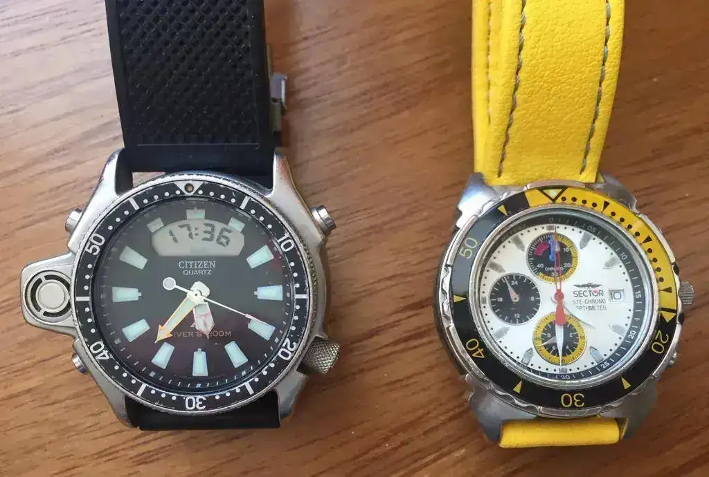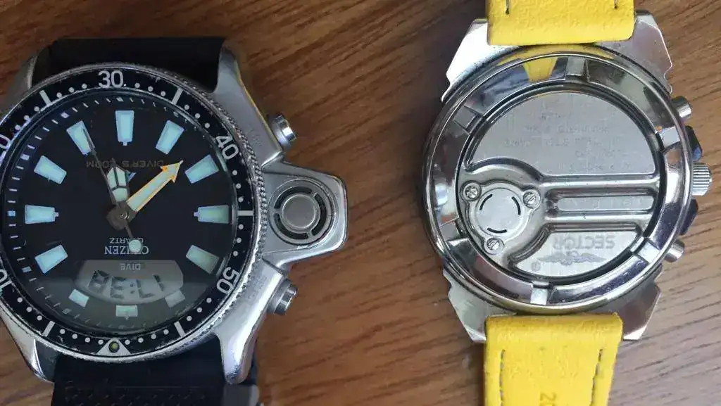 Poco después Citizen presento un nuevo calibre cuarzo con Cronómetro y Profundímetro el Cal. 374, este se empleo no solo en modelos Promaster, si no también en otras marcas, como es el caso de este Sector STE-Chono Depthmeter. En la foto de ambos observamos como el sensor electrónico de presión se ha ubicado en la zona posterior a diferencia del AQUALAND