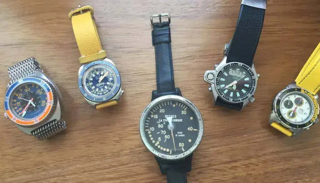 Desde el nacimiento del buceo moderno a partir de la segunda mitad del siglo XX, se hace imprescindible y vital que el buceador tenga constancia del tiempo de inmersión y de la profundidad en que se encuentra. Los relojeros comienzan a desarrollar las patentes de estanqueidad que dan lugar a toda la división de relojes diver que conocemos, y a su vez encuentran una forma sencilla para los cálculos de tiempos de inmersión o descompresión mediante los biseles graduados giratorios. Para determinar la profundidad alcanzada se diseñan Profundímetros que miden los cambios de presión en su exterior y los reflejan como metros de profundidad. Básicamente tenemos 4 tipos de profundímetros, el tipo capilar, donde una burbuja se desplaza por el interior de un tubo graduado dependiendo de la presión que soporta, son los más económicos pero inexactos y válidos para poca profundidad. El segundo tipo es el Tubo de Bourdon, donde la presión deforma un tubo curvado en espiral. Esta deformidad puede mover el piñón de una aguja marcadora. Este invento que se remonta a 1850 con el objeto de medir la presión de un líquido, fue adaptado por los relojeros a sus dispositivos. El tercer tipo es el de diafragma o membrana, donde el agua deforma esta membrana con una presión dependiente de la profundidad. Estos son más precisos y complejos que los de Tubo. Por ultimo tenemos los profundímetros electrónicos, donde una carga eléctrica detecta la presión exterior debida a la profundidad alcanzada.