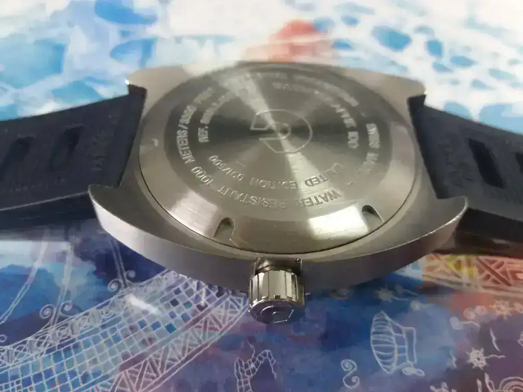 Fondo ciego y enrosacado. No lleva más que la leyenda de las características del reloj y el logo. Se trata de una trasera austera pero perfectamente integrada en la caja, y or lo tanto pasa desapercibida. Si acaso destacaría que al tratarse de una edición limitada y nuerada a 500 piezas lleva el numero de la edicion limitada así como el numero de referencia del reloj, lo que me parece de una gran utilidad. También quiero remarcar que lleva la leyenda de “original vintage 1970”, por tratarse de un reloj inspirado en los modelos de los años 70’s.