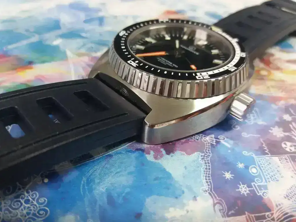 Es un reloj muy bonito y que a pesar de su diámetro se adapta a todas las muñecas por su forma, al no contar con asas. El caucho ISOfrane remata ese conjunto de calidad y le da un carácter tÍpicamente diver. En resumen nos encontramos con un reloj diver con una fuerte personalidad, que tiene sus raíces en los modelos de la marca de los años 70’s pero con una gran calidad y una belleza inconfundible.