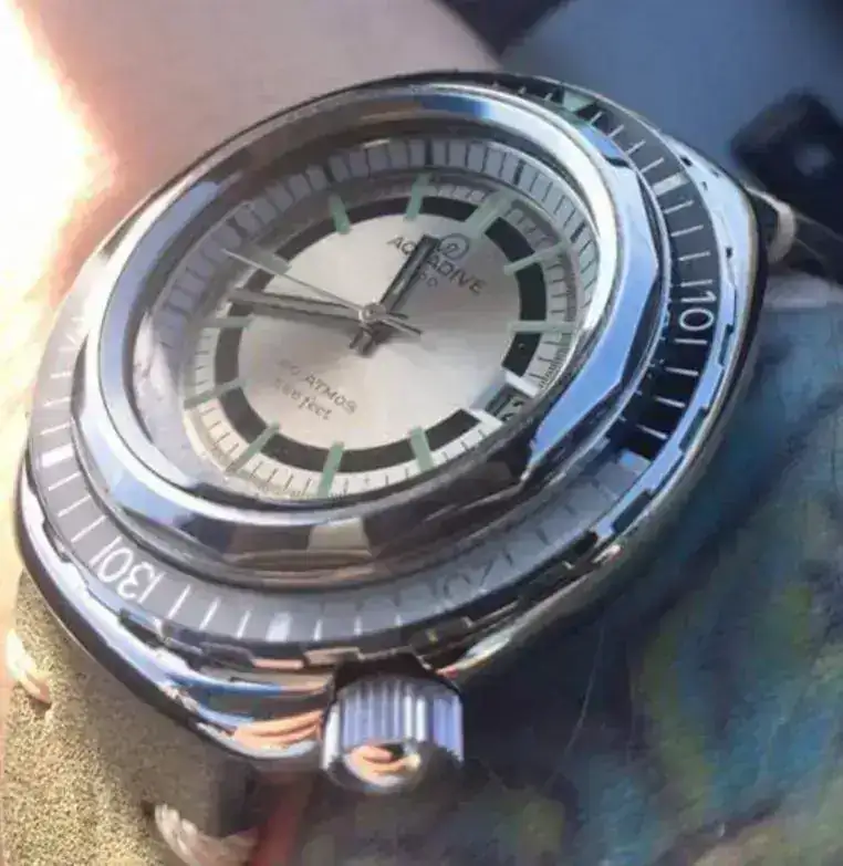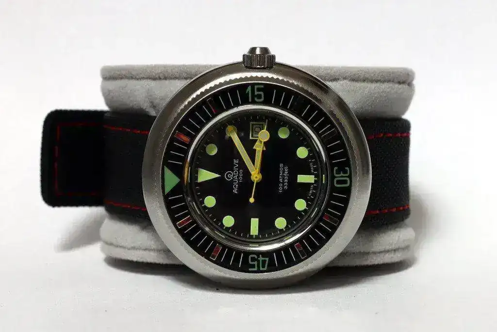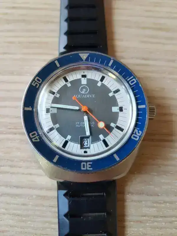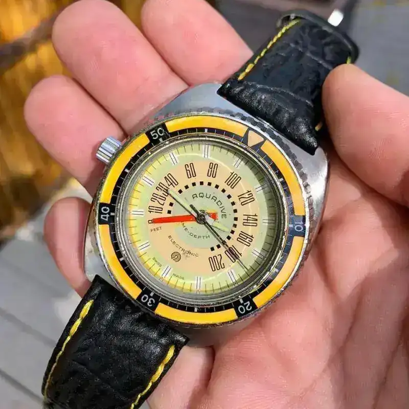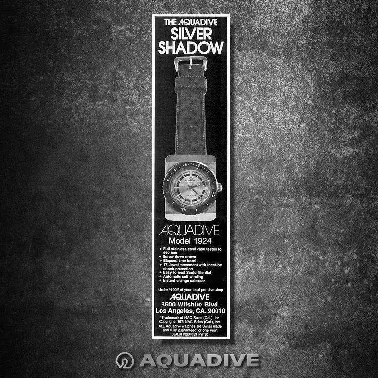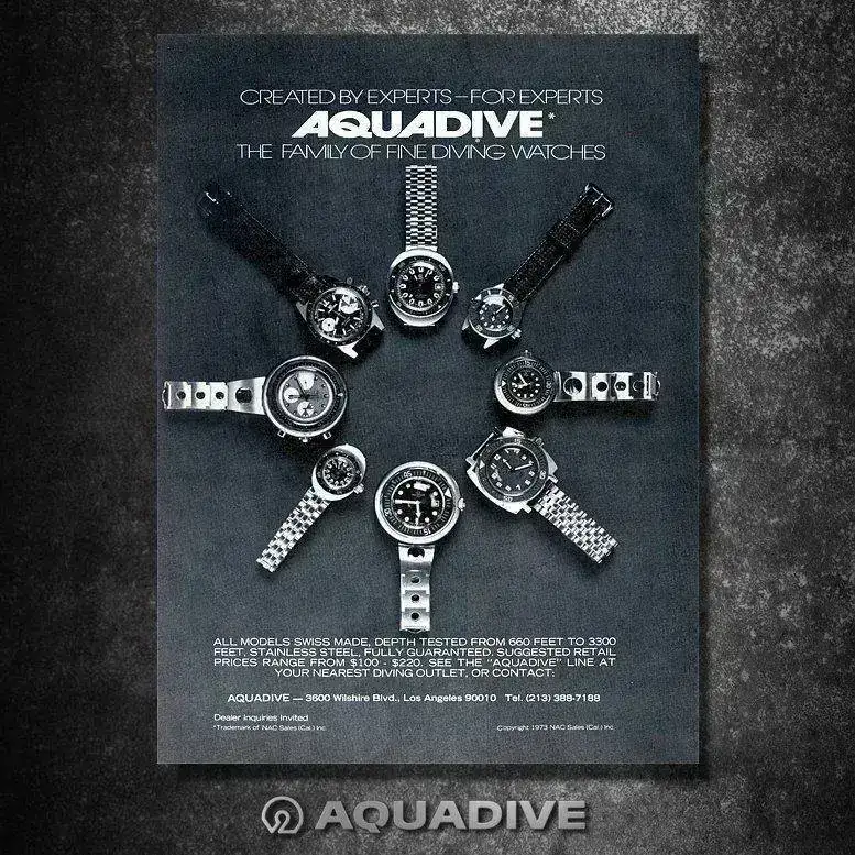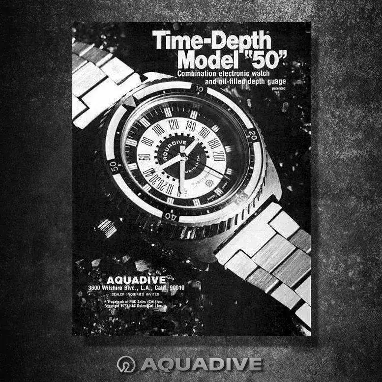 Aquadive se creó en el año 1962, tuvo una corta vida que se alargó hasta los años 70’s en que la Crisis del Cuarzo truncó su historia, y dejaría la marca en punto muerto, como muchas otras marcas que sucumbieron a la crisis. A pesar de no ser una marca muy popular, era conocida y apreciada por los submarinistas sobretodo por su modelo “Gauge” Time-Depth 50, que incorporaba un profundímetro que permitía conocer los metros que descendían los buzos a través de una válvula que dejaba entrar el agua y así medir la presión que aumentaba a medida que descendían.