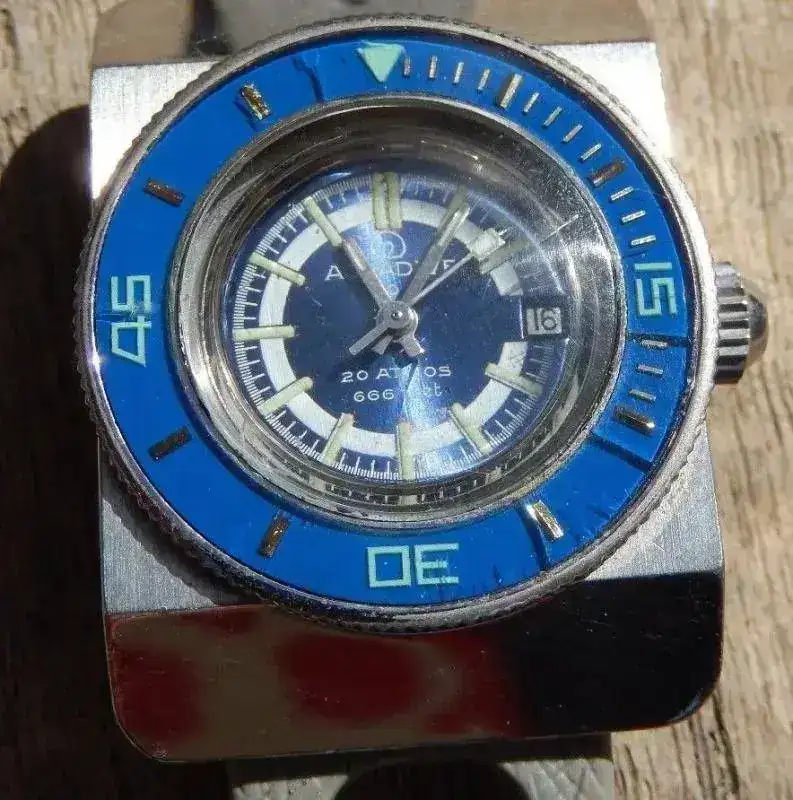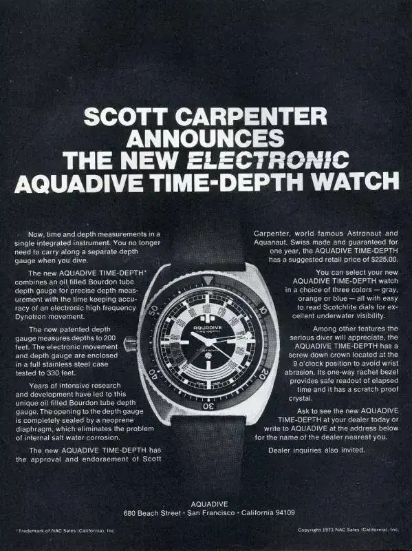 No he encontrado datos relevantes sobre su historia, y en su pagina web www.aquadive.com , tampoco dan mucha información sobre la historia de la marca. Así que para dar una idea de la marca me remito a las imágenes que he encontrado de los modelos que fabricaban en los años 60’s y 70’s, entre los que destacan el modelo 1924 de una robustez y solidez que lo convierten en una firme y pesada herramienta para los submarinistas, como también lo fué el modelo Caribean que aunque tenía unas formas más redondas y suaves contaba con una caja monobloque contundente y a prueba de golpes. Pero el modelo con el que destacaron fue el Time-Depth 50, un reloj electrónico, que contaba con un profundímetro que medía el descenso de los submarinistas hasta los 60 metros con una tercera aguja. Se basaba en una válvula que dejaba pasar el agua a un tubito de rodeaba la caja y que permitía medir la presión y con ella la profundidad.