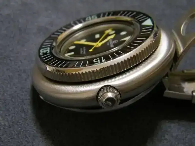 Caja de acero AISI 316L en forma de cojín de formas suaves y bien proporcionada, cepillada en su frontal y en los costados, con el borde pulido lo que le da un discreto toque de distinción. La forma de la caja se adapta perfectamente a la muñeca y es cómodo de llevar, a pesar de ser un reloj que por su peso de 130 grs. sin contar con la correa, se hace notar. Mide 43 mm. de diámetro lo que a algunos puede parecer excesivo, pero sin embargo la distancia entre asas de 49 mm. la convierte en apta para todas las muñecas, pues al ser las asas practicamente inexistentes acorta de manera considerable la longitud. La anchura de asas está en consonancia con el diametro y las dimensiones de la caja. Cuenta con Valvula de Helio disimulada en el interior de las “asas” inferiores, con lo cual no se “estropea” el lateral de la caja con ese agujerito. Me parece un detalle de agradecer.