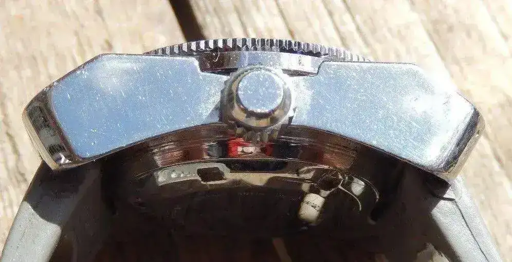 La corona está situada a las tres, y viene firmada con el logo de la marca. Tiene un tamaño suficientemente grande tanto de anchura como de longitud para que pueda ser manipulada con facilidad, sin que tengamos que usar las uñas para moverla. No lleva ningun protector de corona por ser una caja inspirada en un modelo de los años 70’s y se ha querido mantener esta estética setentera.