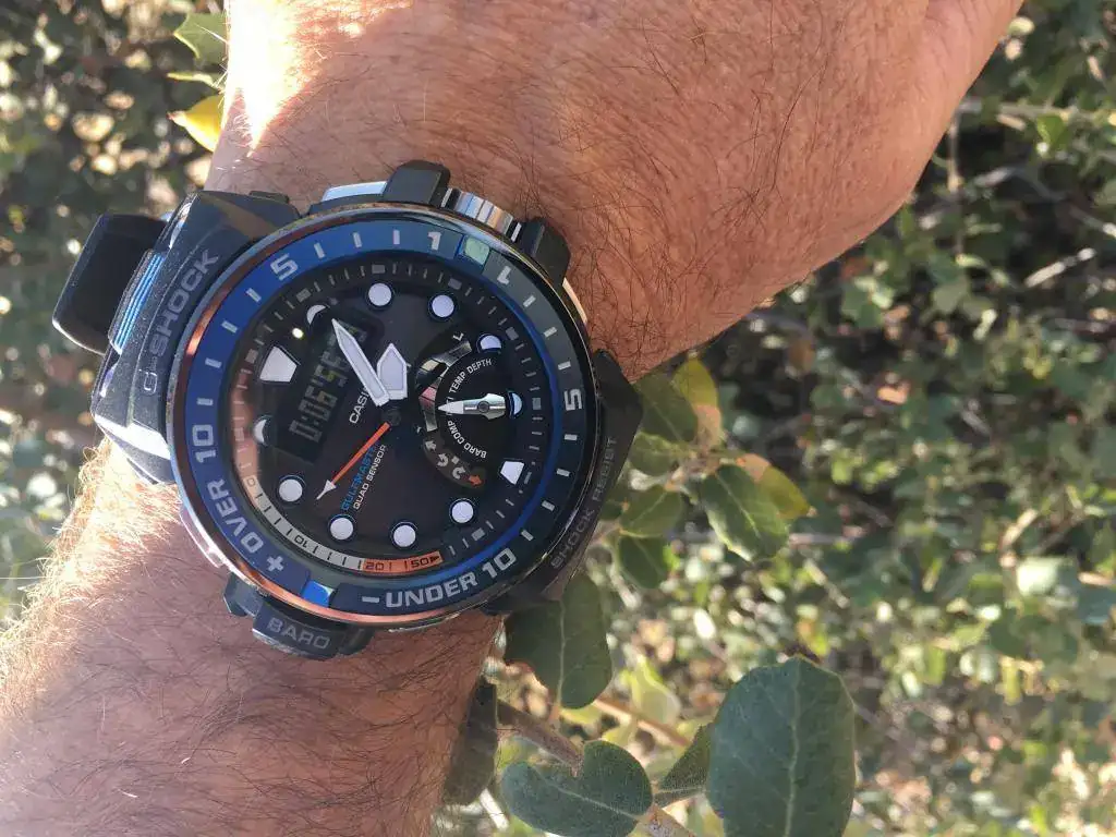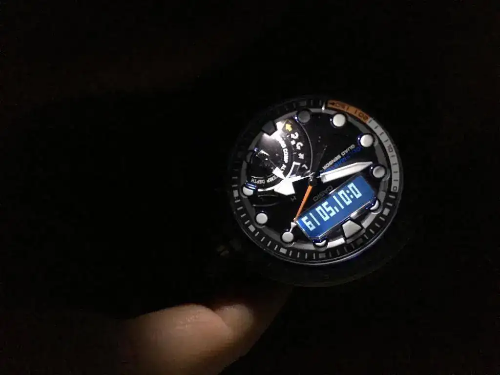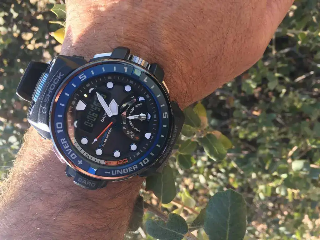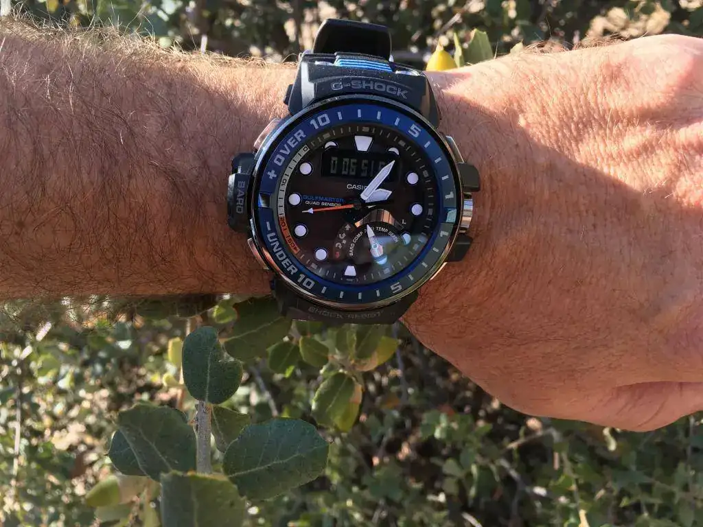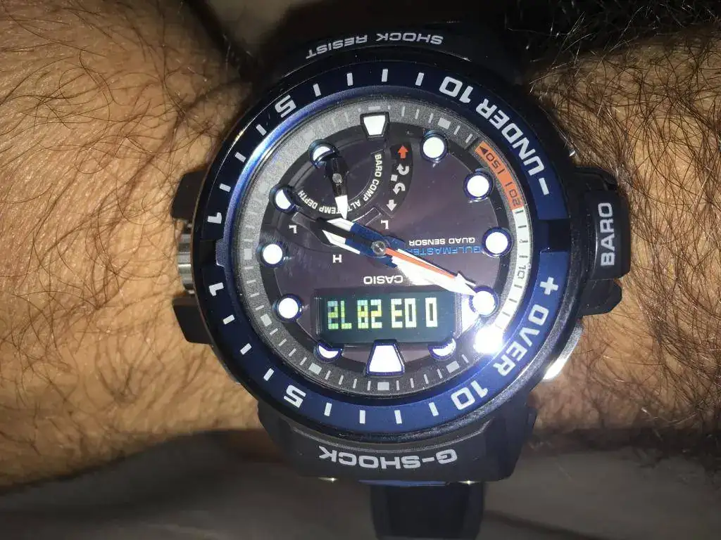 Otro aspecto “discutible” es que el display digital invertido, con un tono levemente azulado, se lee peor que el del Muddie. Yo soy anti displays invertidos, pero no el del Muddie, que tiene un contraste perfeto y se lee en casi cualquier circunstancia perfectamente. El mejor de Casio en un anadigi. El del Gulfmaster tiene mucha mejor legibilidad diurna que los invertidos tradicionales, pero está un punto por debajo del Mudmaster. Lo pongo como opinable, porque permite que el display digital sea más discreto y se note menos, lo que muchos (no yo) valoran, y sigue manteniendo una legibilidad diurna de calidad y suficiente. Pero aquí hay más argumentos para la versión con display positivo que con el barruriento.