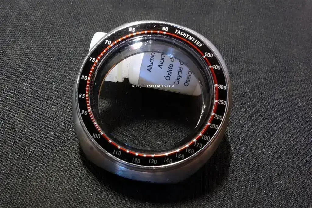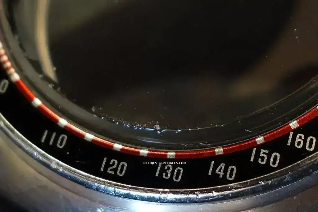 -Bisel en acero pulido con insert metálico negro con escala taquimétrica destacada en fondo rojo.