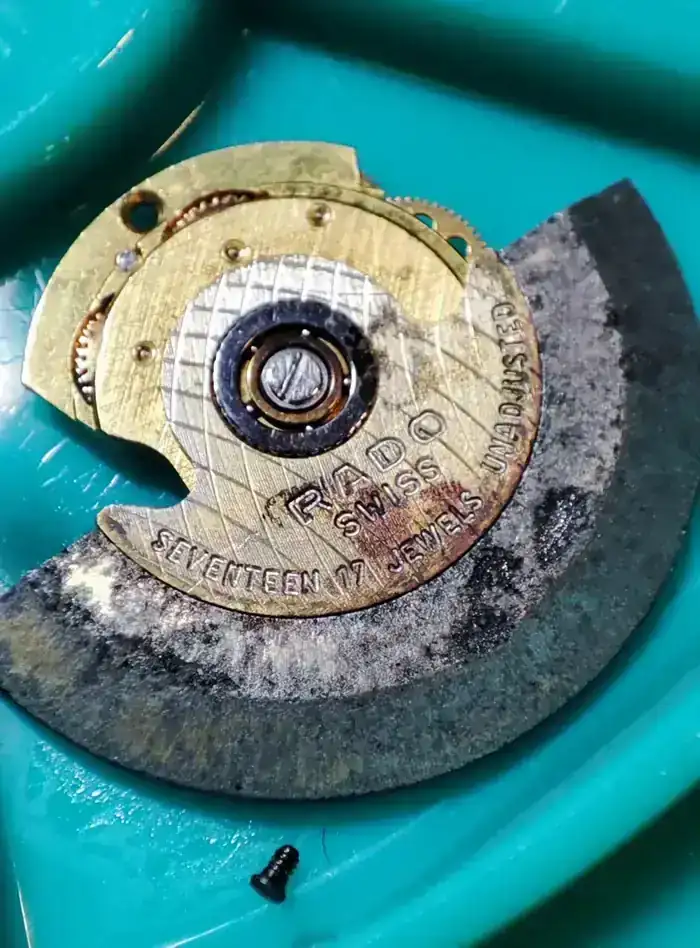 Y empezando por la mitad, aquí podéis ver como de mal estaba la masa oscilante, pero mi sorpresa fué al ver "17 jewels" marcado en ella!!!