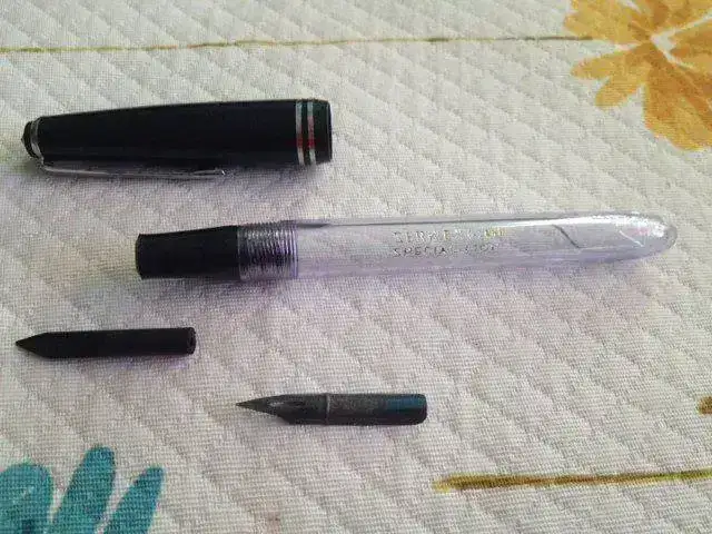 Tenía una serwex demonstrator India que me regalaron con el culote roto tras una leve caída al suelo, muestra una vez mas de la fiabilidad de las Indias, jejeje La pluma no iba mal, la verdad y el alimentador me gustaba bastante es de ebonita y clon de los antiguos waterman, con buen flujo y un buen ajuste. Le he puesto un plumín Guillot flexible de palillero, bastante bueno para hacer Copperplate, y para arreglar el culote simplemente un poco de celo por fuera; el resultado....