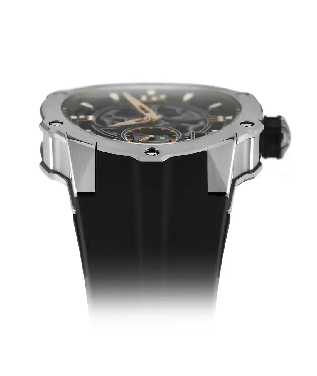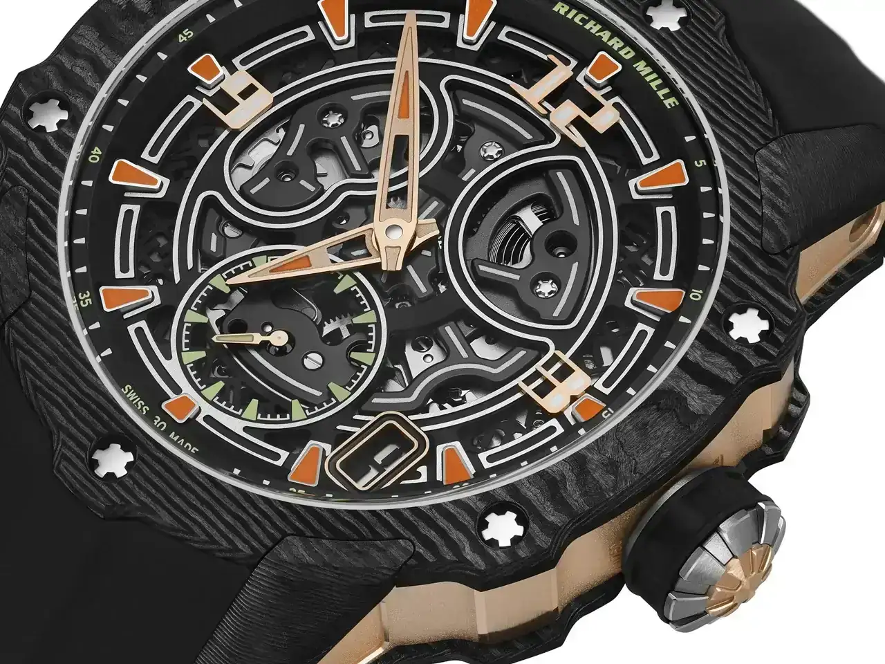 Ya sea en Carbon TPT® -con carrura de oro rojo 5N- o en titanio de grado 5, la caja se distingue por las líneas depuradas de su diseño de inspiración deportiva, que fusiona la curvatura característica de las cajas tonneau de la marca con los rasgos distintivos de sus relojes circulares. Asegurada mediante los emblemáticos tornillos spline de titanio de la firma, la estructura en tres piezas de la caja exhibe una combinación de acabados satinados y pulidos. Ambas versiones miden 41,7 mm de diámetro y apenas 9,7 mm de grosor, una dimensión compacta que las hace adecuadas para cualquier muñeca que pueda pagar su precio.
