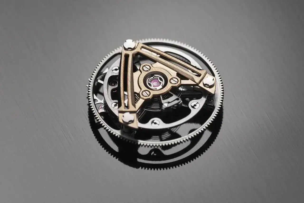 Simulaciones exhaustivas del conjunto, incluida la caja, determinaron que el calibre se situara a 5 centésimas de mm del fondo de la caja en 6 puntos de apoyo, lo que contribuye a la rigidez del reloj. Este patrón en X se reproduce visualmente en toda la caja, al tiempo que garantiza que el bisel, el reborde y el fondo monobloque conserven sus propiedades independientemente de las circunstancias.