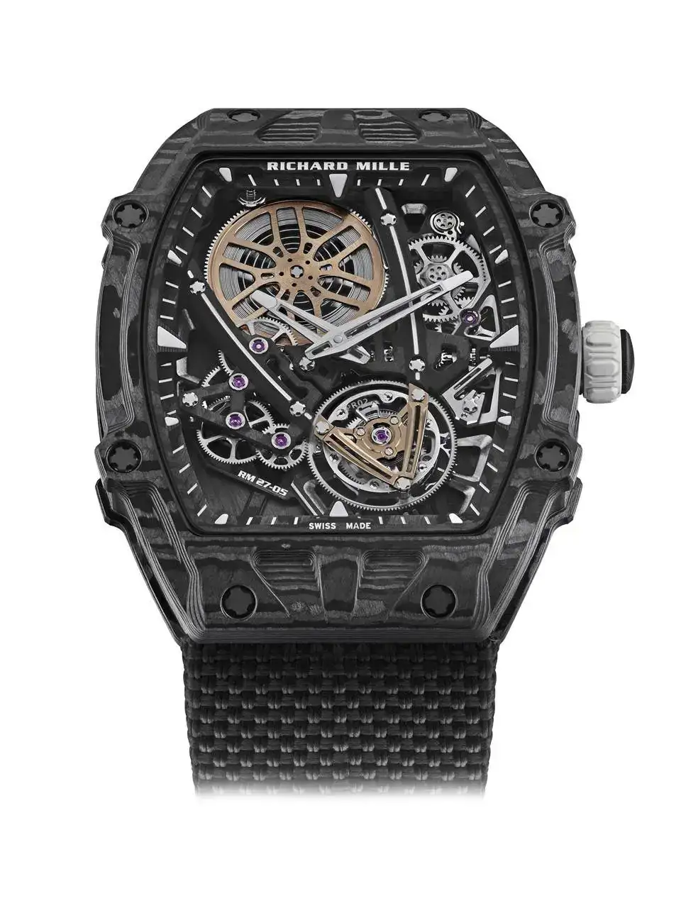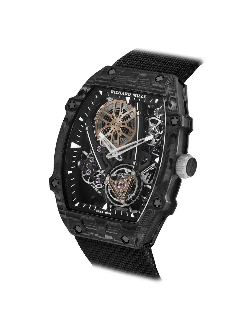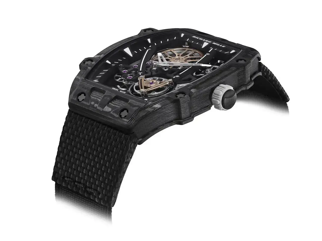 No se ha escatimado en la producción del RM 27-05 Flying Tourbillon Rafael Nadal. Si bien su sobriedad representa un retorno a las raíces de la colección, repensar el proceso de fabricación de relojes ha sido un objetivo fijo en cada etapa de su desarrollo. El movimiento no esta sujetado a la caja con tornillos, sino que todo el mecanismo se aloja dentro del conjunto monobloque fondo/caja, que a su vez está rematado por el reborde y el bisel: este conjunto sujeta el calibre para mantenerlo en su sitio. Lo que confiere a este modelo una gran ventaja son las cualidades de un nuevo composite, el Carbon TPT® B.4, un material anisótropo optimizado que permite mecanizar la caja con secciones transversales cada vez más finas.