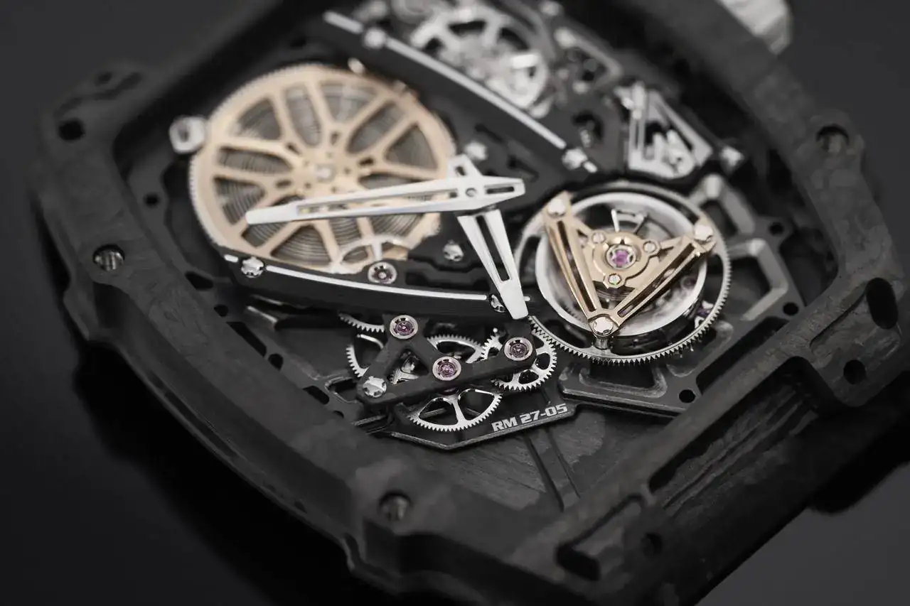 El proyecto RM 27-05 se podría resumir como una investigación para eliminar peso. Su platina de titanio con tratamiento PVD está óptimamente esqueletada y acabada a mano, incluso las partes ocultas. Los puentes también son de titanio de grado 5 y Carbon TPT® lo que los hace aún más ligeros.