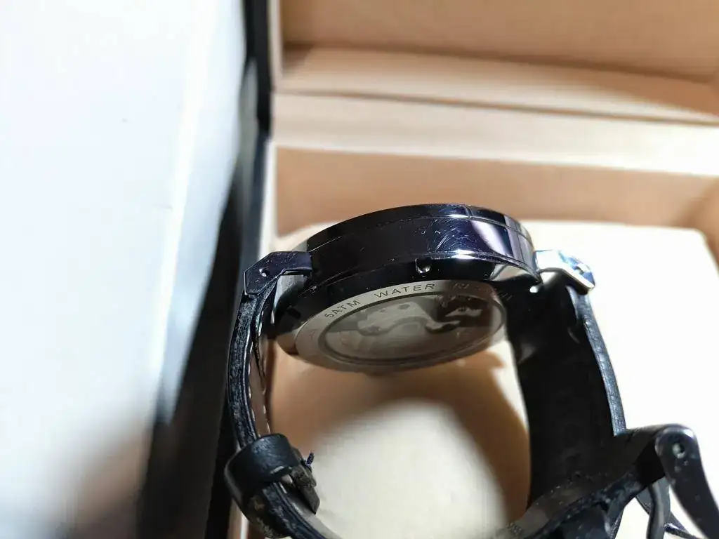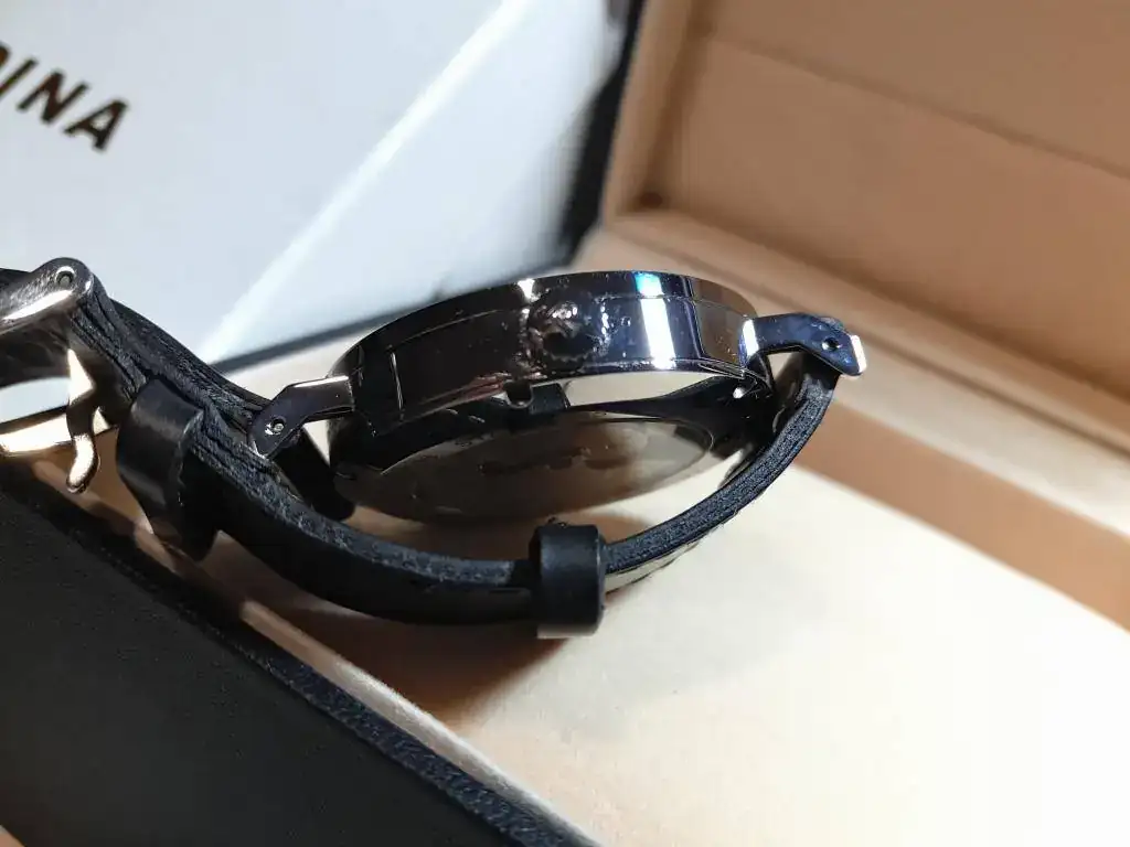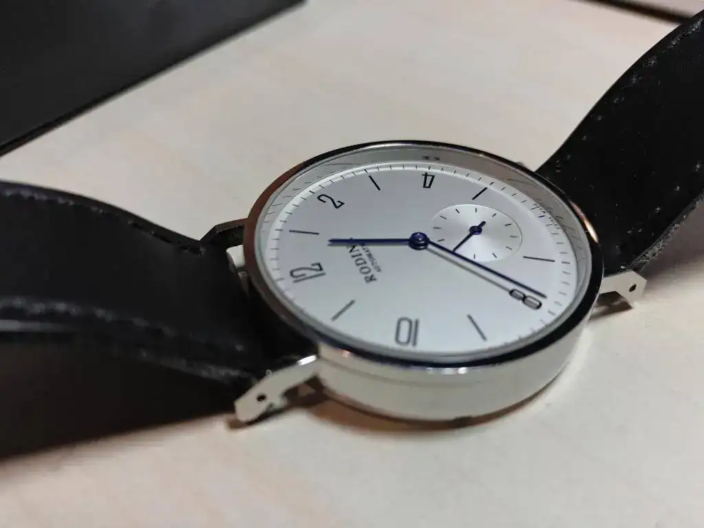 Lo mando con una correa original de Nomos que compré expresamente para el reloj, de cuero negro, con bastante vida por delante y que le queda francamente bien.