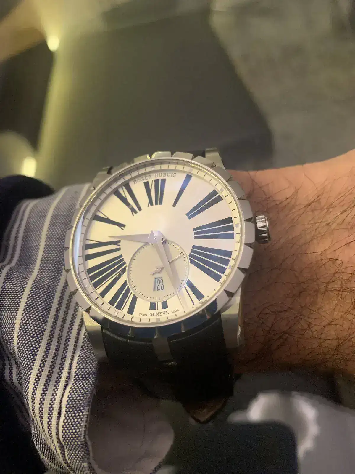 Esta caja tiene todos los rasgos característicos de Roger Dubuis, como es la tercera asa central en cada lado, el generoso guarda-coronas con tornillos o el bisel con muescas triangulares. Esta vez, los relojeros de la casa han querido aplicar los acabados de Alta Relojería también en ésta: el resultado es una serie de ángulos rectos y planos como ninguna máquina podría jamás aspirar a conseguir.