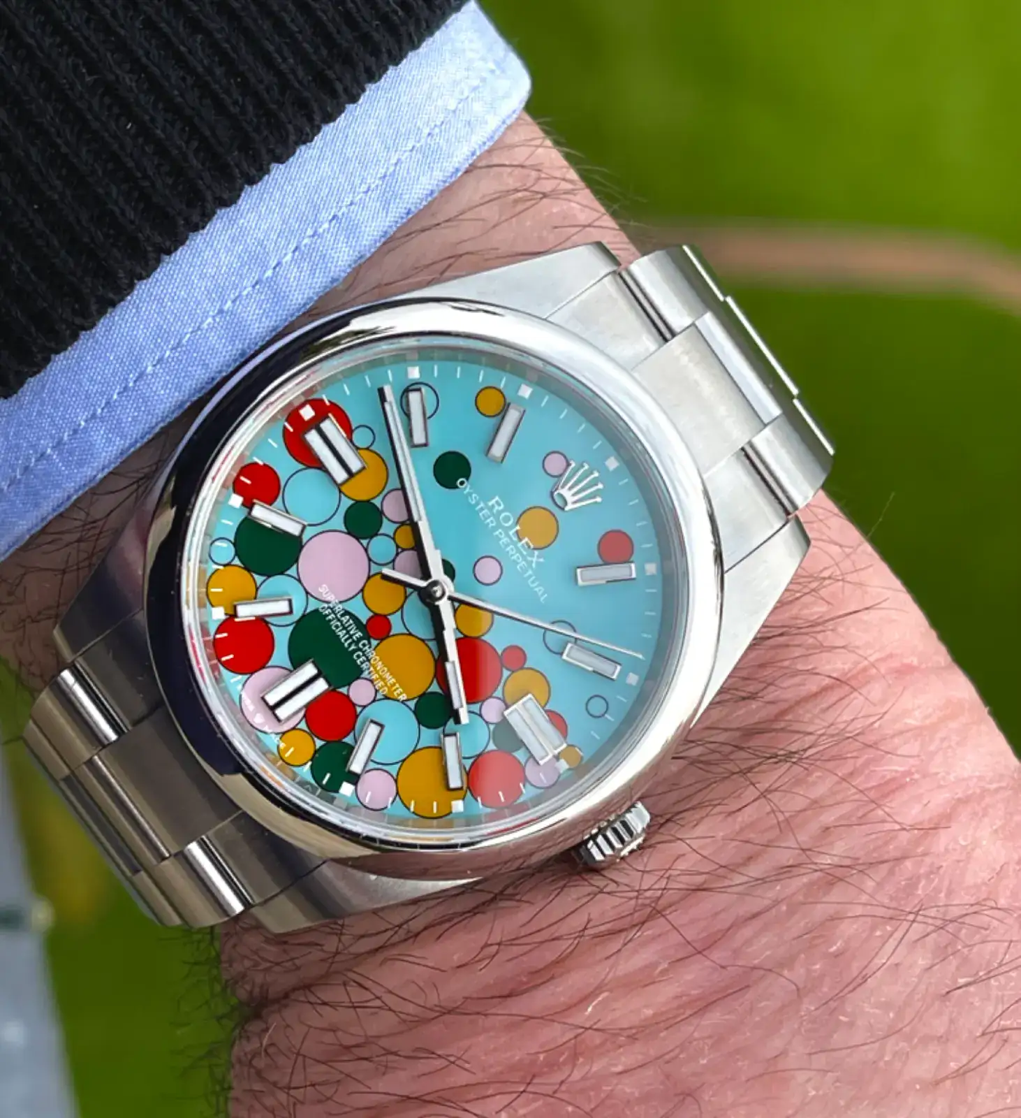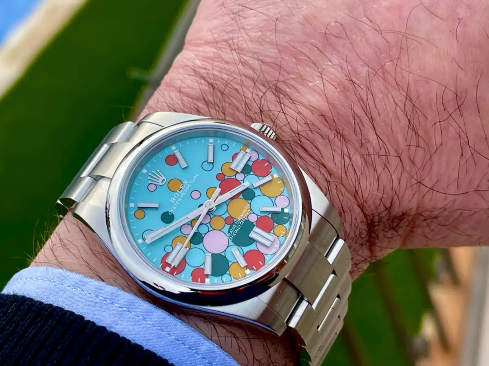 Es que, azul bebe no es el termino correcto, se llama ICE-BLUEA mi tampoco me gusta, pero en términos generales me sigue pareciendo una brisa de aire fresco para quien tiene de todo. El Daytona nuevo de oro amarillo con esfera azul bebé me parece mucho más ofensivo para la vista.