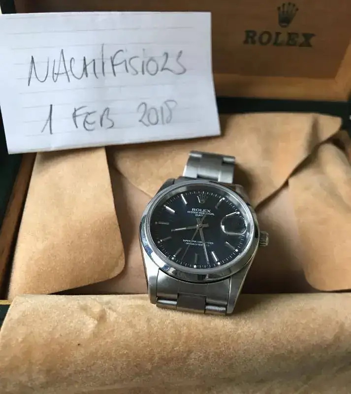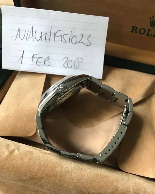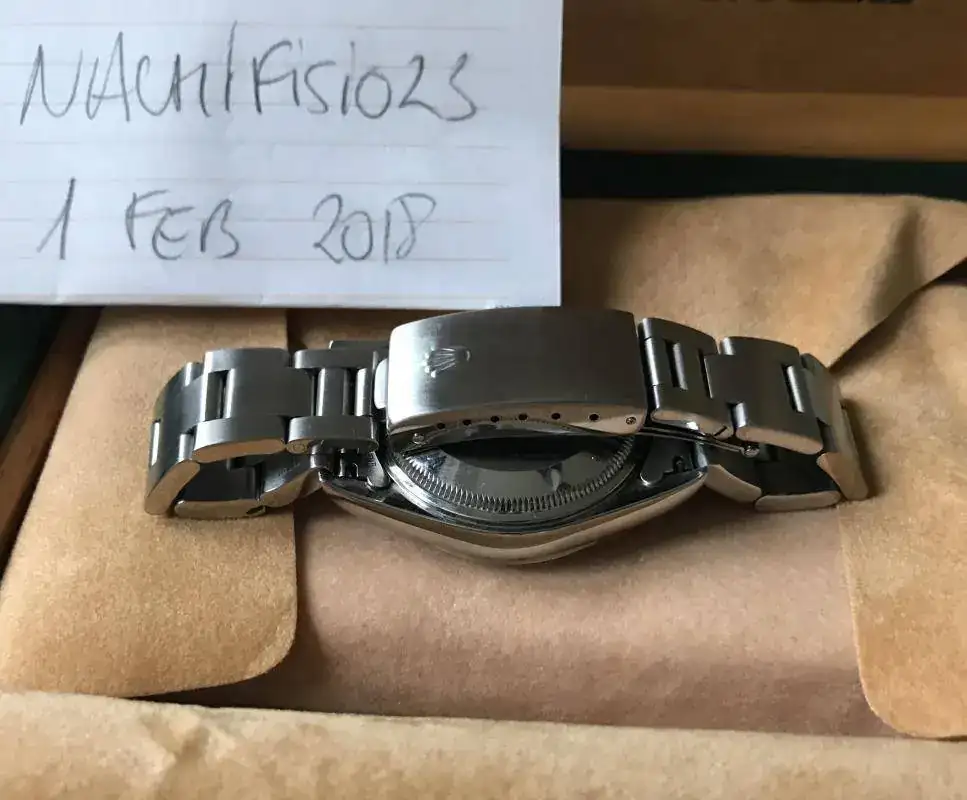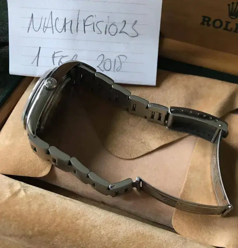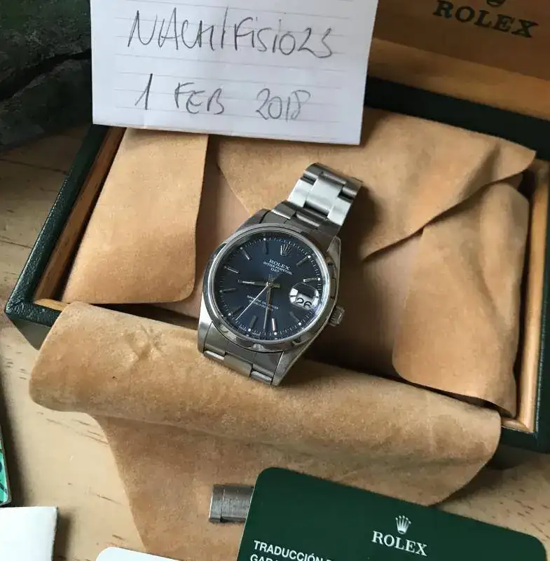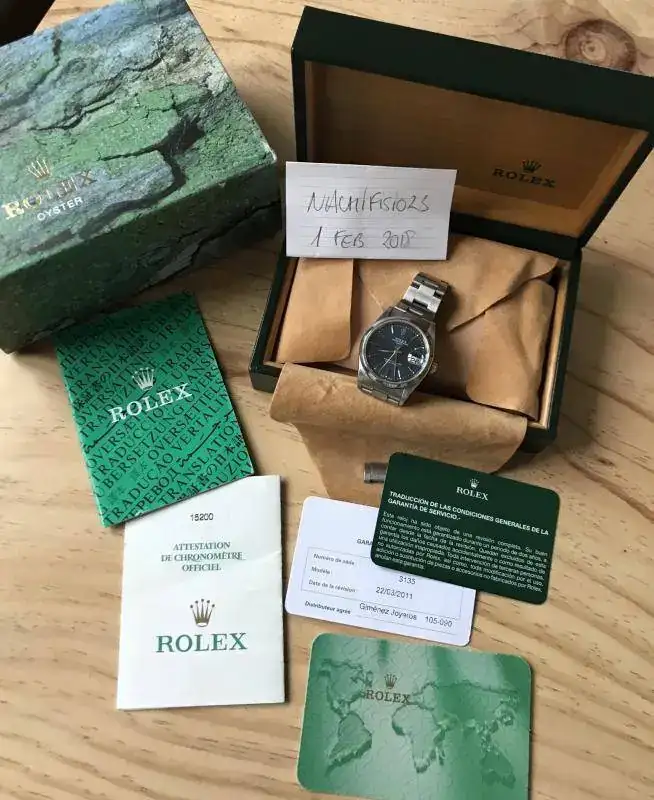 Viene con un set bastante completo: caja de piel, caja exterior de carton, calendario, garantía original, eslabon sobrante, libro rolex traducción y las tarjetas de un servicio que se le hizo en el 2011.
